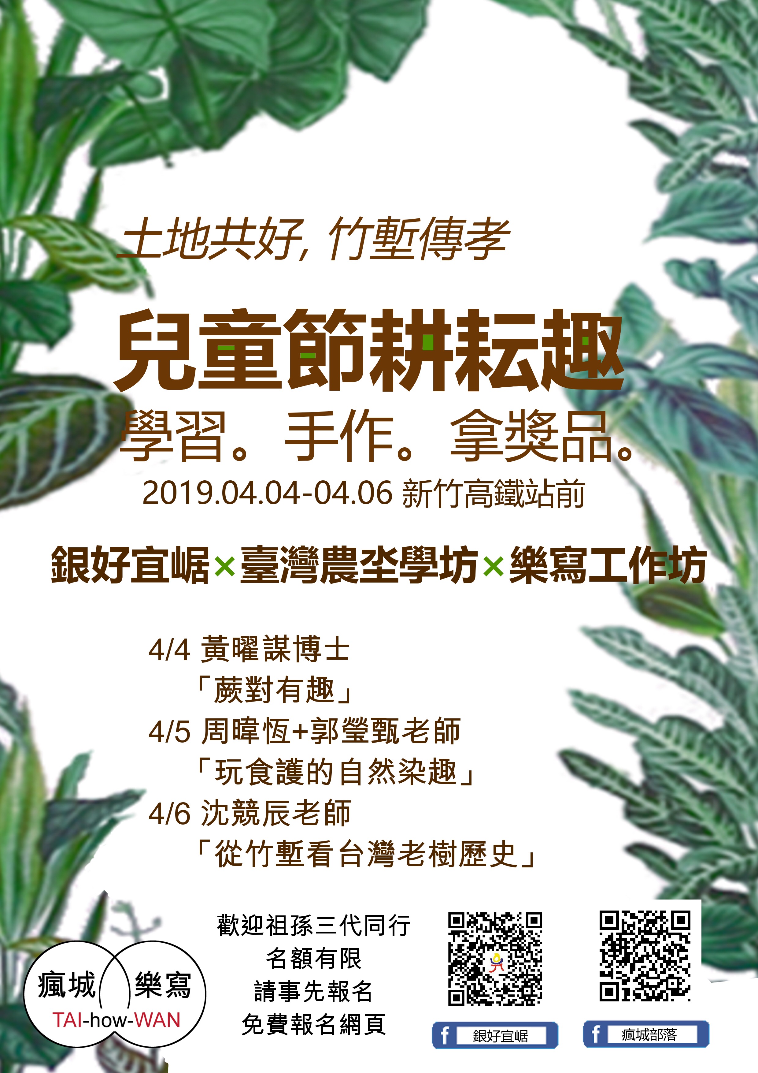 今年四月,在新竹高鐵站前,穿越青綠有生命力的竹林,「台灣農坔學坊」有一群在地友善耕作的農人,要和您分享自然新鮮的農產品。除了展售的各類蔬果與農產加工品外,還有老樹、蕨類、大地色彩三個主題的戶外藝廊展出,邀請此領域的專家老師,帶您一起聽老樹故事、實作拓印與植染。