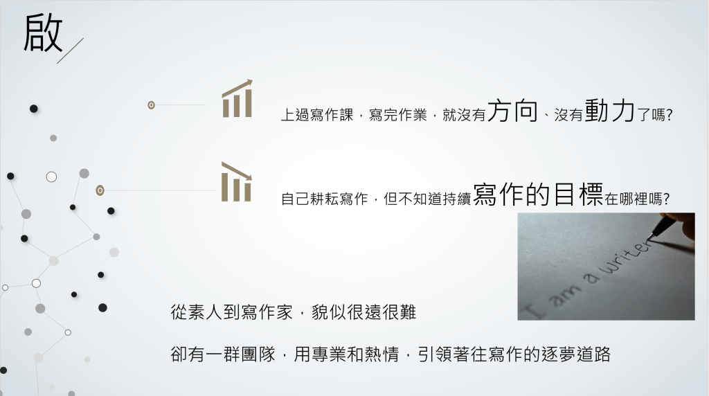 • 速成寫手招募:本身沒有任何寫作經驗,但渴望出書,晉升為專業作家,千萬不要錯過這次特別計畫,每周一次作業指導,讓你快速進步。本方案酌收學費6000元,除了提供線上課程,還提供十次教練媒合指導及每周一次線上教學。