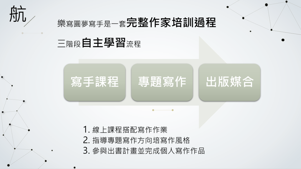 • 十二月底前直接進入高級班,參與百年大業計畫,在教練指導下完成採訪文、掌握專業出版品的寫作魅力,並且順利參與出書過程,晉升為作者之一。