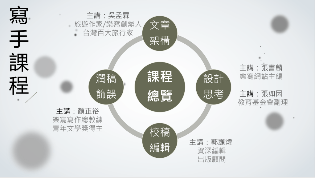 樂寫是一個結合寫作、閱讀與夢想的團隊,透過講師授課與寫作教練帶領,逐步完成屬於自己的寫作目標。也藉由討論與共讀計畫,分享並知道如何改進自己的作品。
