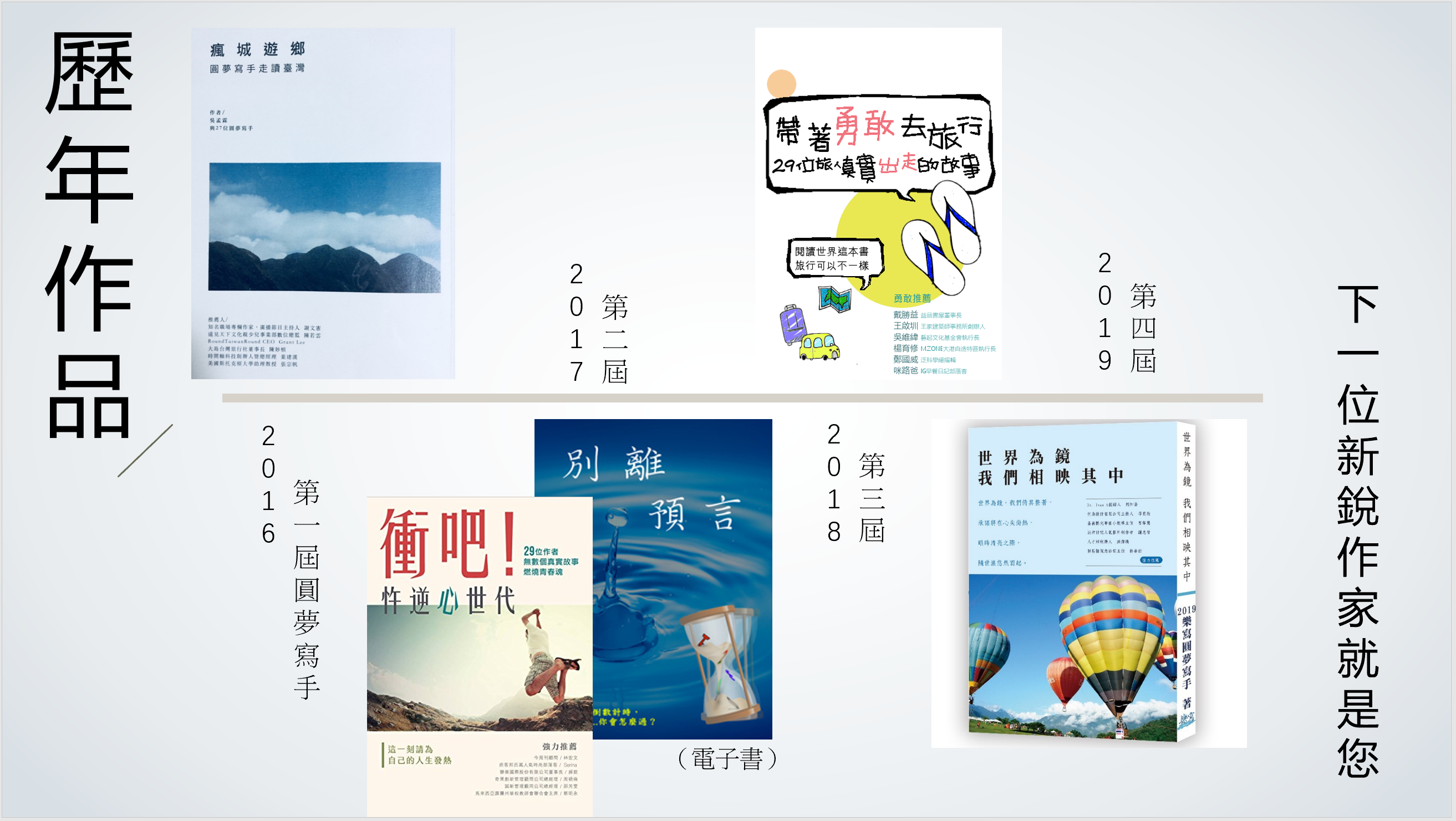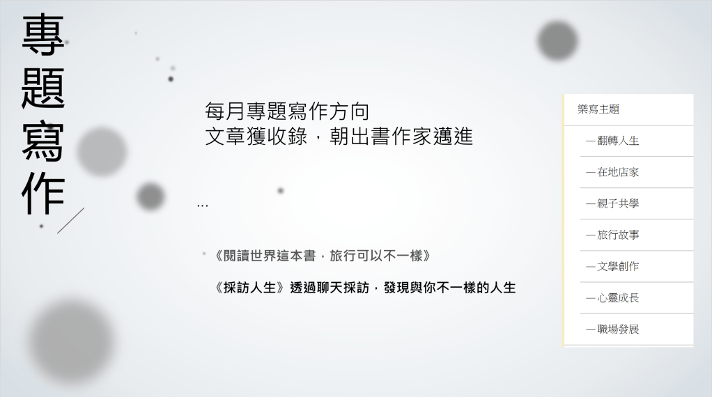 • 專業寫手招募:如果你已經擁有採訪店家經驗,並且曾經刊登任何文章在媒體或報章雜誌上,免費錄取,直接參與年度出書計畫。