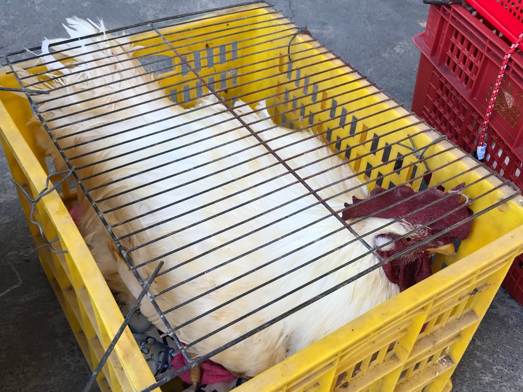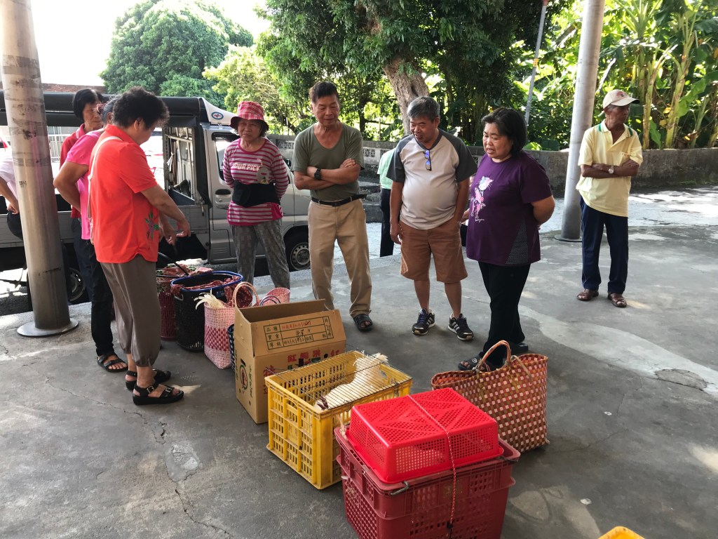 步出廟埕,遇見許多長輩抱著大紙箱,或提著大竹籃前來,原來我遇上的是一年一度的閹雞秤重比賽。客家聚落會在下元節(農曆十月十五)前後一個月左右,開始輪流「謝平安」。當地的人說,乾元宮以前會在秋分之後,視農務收成情形,選一天舉行平安戲,以敬謝上天一年來的保佑。而平安大戲的前一天,就會舉辦閹雞比賽。但是,後來種田的人變少了,如果平安戲選在非假日,參與的人就會更少,後來大家決定把平安戲訂在雙十節,閹雞秤重就在十月九日進行。