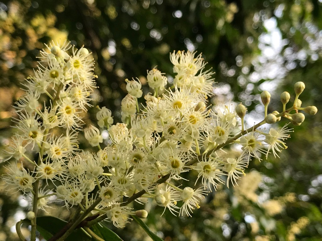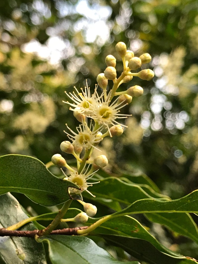 霜降時節,是新埔飛龍步道刺葉桂櫻的花期,大約一週左右,能不能遇上,還要看緣份。看著眼前古道上,大樹的純潔綻放,我在想,這棵刺葉桂櫻和新埔那區域的刺葉桂櫻,會不會有關係呢?