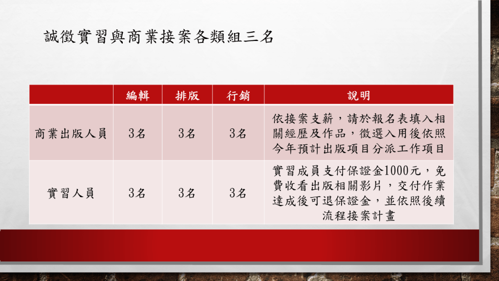 沒有經驗過出版計畫的人,也可以透過學生實習的方式進行團隊招募