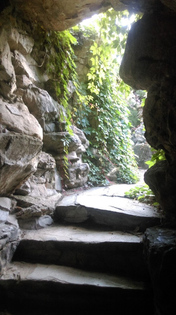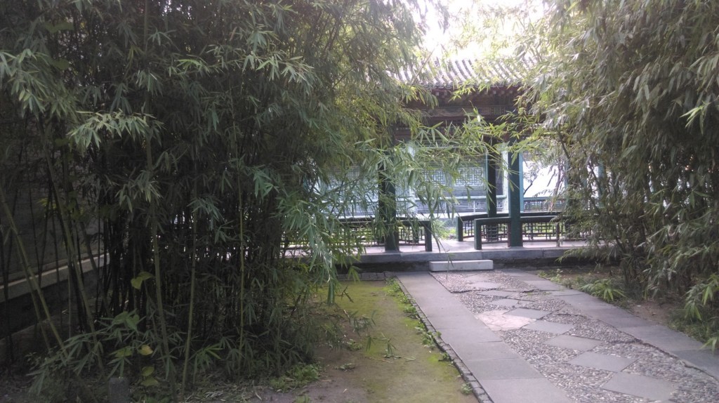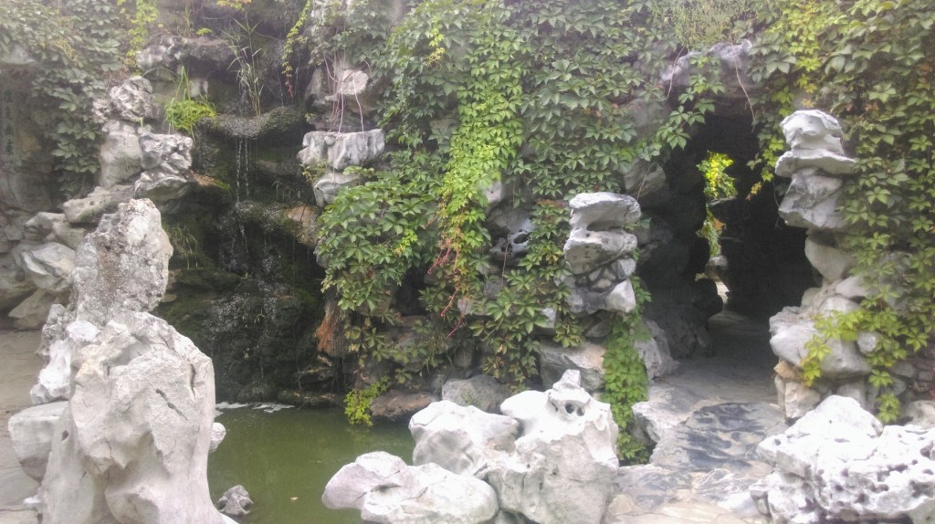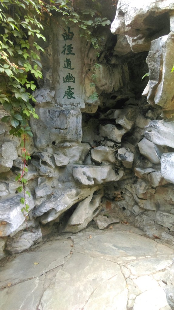 這岩山邊有一約二人寬的通道,因兩側山壁擋去了陽光,既陰暗,又因裏頭九彎十八拐,前後不見人影而只聞其聲,彷彿迷失在石林疊嶂的狹縫中,令人心慌……。加快腳步,在轉折處嗅到一絲水氣,又經一岩洞,果然來到一個如天井一般的明亮空間,想是已經到達那岩山的中心,那穿梭在岩石中的涓涓流水匯集至此,成了一汪池水。旁邊的石壁上,以綠色楷體題字為此落下一個精闢的總結——曲徑通幽處。題字之處不遠便是出口了,視野豁然開朗,白石寬路依著池水環繞,延伸至水中央,有一長方頂的大涼亭,想必便是書中「繞隄柳借三篙翠,隔岸花分一脈香」的沁芳亭了。山窮水盡之後是柳暗花明,曲徑通幽,彷彿在這如畫的景色之上以妙筆點題,又蘊含著天無絕人之路的古老智慧。