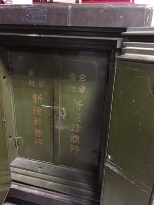 辦公室的一角,有一個低調又吸引人目光的老舊鐵櫃。這個老櫃子肯定充滿了歷史故事,央求吳總打開與我們分享關於那段珍貴的歷史記憶。旋轉密碼鎖,打開厚達十多公分的第一扇鐵門,映入眼廉的又是一扇墨綠色鐵門,上方寫著「合資會社新復珍商行」。再插入一把老鑰匙,開啟第二道鐵門。打開後,是一個留有斑駁使用痕跡又保存完好的木櫃。如此做工精細又完存近百年的老鐵櫃,蘊含三個世紀,時代風華最佳見證。