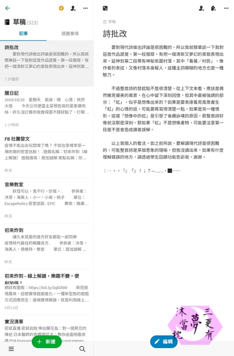 因為它的介面真的順暢好用,點一下「+」號就新開一篇,近期所有文章條列在左側,也可把編輯區域切換成全幅,又俐落又直覺。並且同時支援網頁版、桌面板以及移動裝置版的資料同步,讓你從手機寫到主機,從桌前寫到床上,對我這種只能在零碎時間快速寫一兩句話人來說,非常方便。即使最近六個月它移動版一直有一個可怕的 Bug,開文章後會跳出轉圈圈畫面,然後卡在那裏,我還是排除萬能設法繼續用下去。