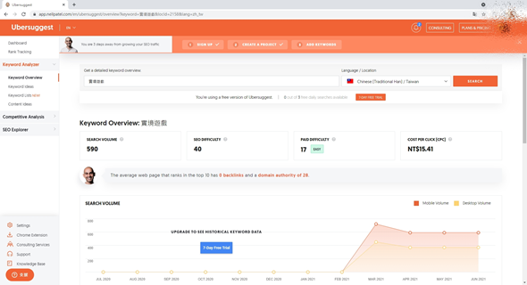 在 Ubersuggest 的報表會列出以下幾個資訊: