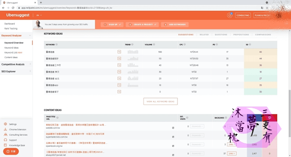 Ubersuggest 是一個聊勝於無的關鍵字分析工具。部落格的命脈就是流量,而流量又受到關鍵字影響,這套工具可以告訴你某個關鍵字在網路上被搜尋的次數,以及這個關鍵字在曝光上的競爭程度(使用人多,機會自然被稀釋)。不過因為它在中文的效果沒那麼好,免費版又只有一天三次的分析額度,使它變得有點雞肋,不過能掌握的資料越多越好,規劃文章時可分散幾天測試,找到適合自己的關鍵字。