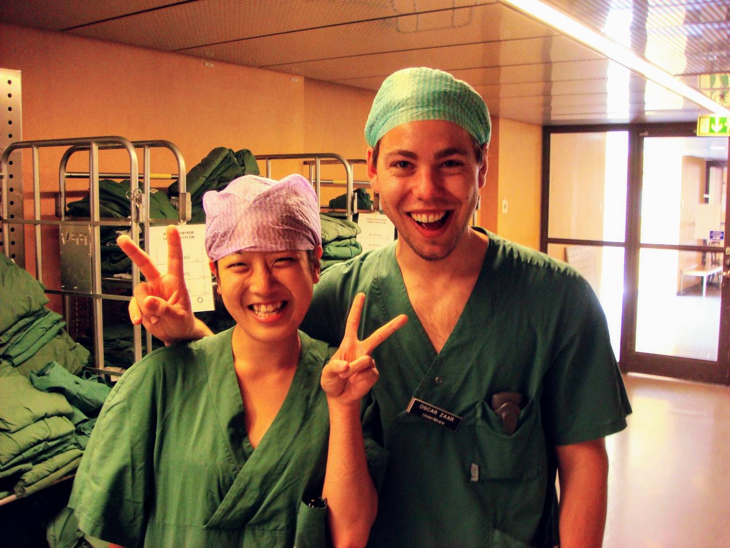 實習醫師Oscar是個溫柔親切的學長,總是耐心地跟我解釋病房的大小事,帶著陽光的笑容回答我每個問題。醫院生活都是用我聽不懂的瑞典話溝通,查房時Oscar總會抓緊每個空檔為我翻譯病患發生甚麼事然後剛剛醫生怎麼回答,在一群同事哈哈大笑時他會趕緊轉頭為我解釋笑點在哪裡,中午一起吃飯我總迫不及待的跟他分享前天晚上交換學生們去哪裡喝酒在哪裡跳舞,聽到我在瑞典過的這麼精采融入他很為我開心。