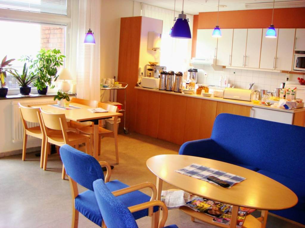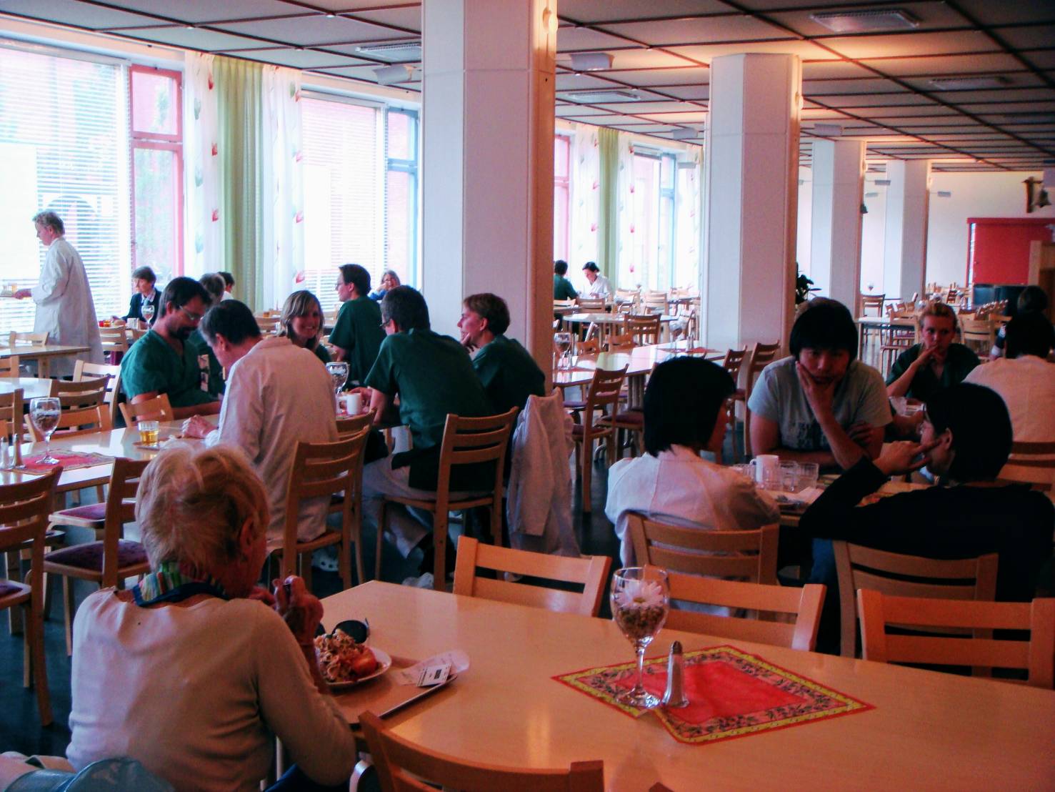 瑞典的家屬只能在固定的時段前來探病,病房的氛圍是很安靜的,病人可以進出交誼廳倒個咖啡然後坐在窗戶邊看雜誌。醫院的餐廳是自助式的擺盤,最特別的是有全天候供應的輕啤酒讓員工取用! 午餐時間從一到兩個小時不等,若有認識的醫師經過,大家就會招呼他坐下,繼續邊吃邊聊,和台灣匆忙的用餐氣氛截然不同。