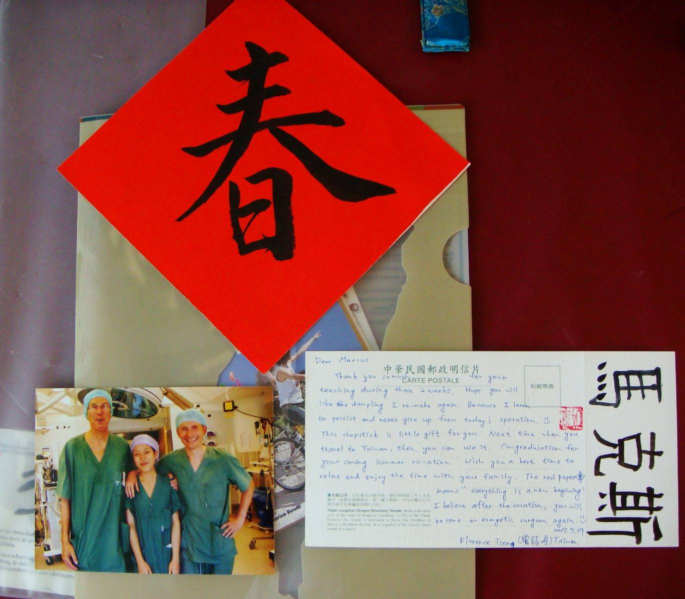 一個月的見習生活很快就到了尾聲,和他們相處的日子彷彿家人一般,要離開前我非常的捨不得。見習的最後一天我一早去病房準備包水餃,在小廚房弄餡料自己捏,煮好後一盤盤的端去會議室,並教導他們使用筷子。我用毛筆寫下每個醫師的中文名字,搭著春聯和台灣風景明信片送給他們,為這段異國友情畫下美好的句點。