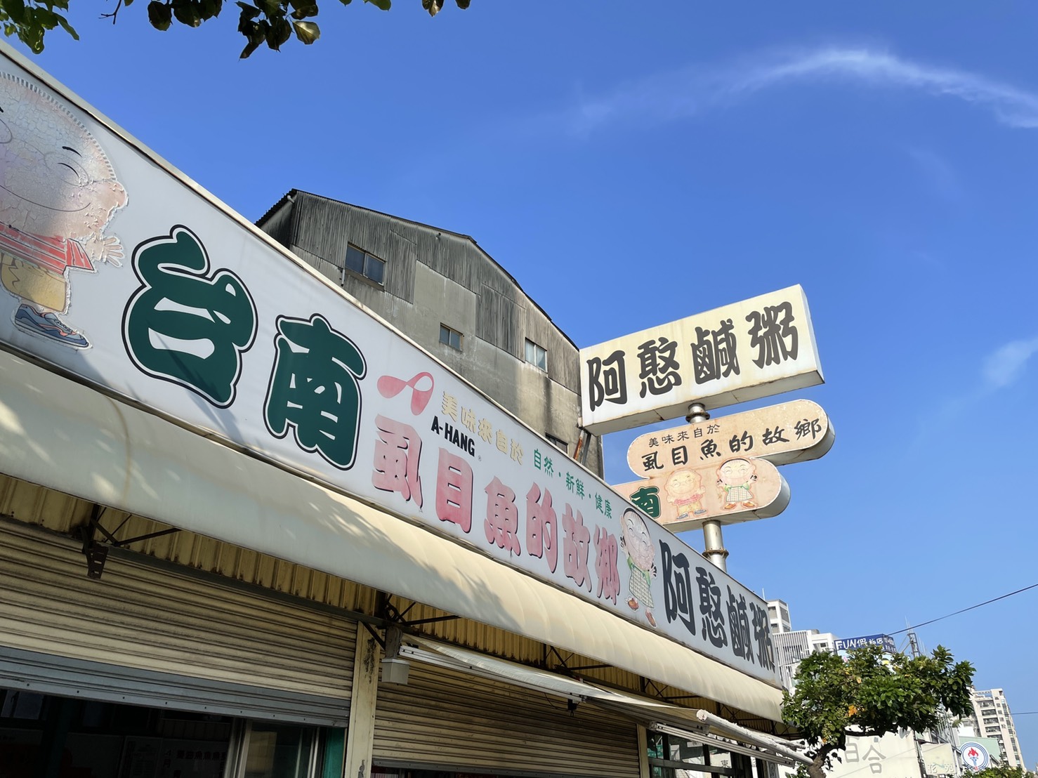 用餐後,走出店門口,望向大大的招牌,藍天把「阿憨鹹粥」四字襯托的更加立體。