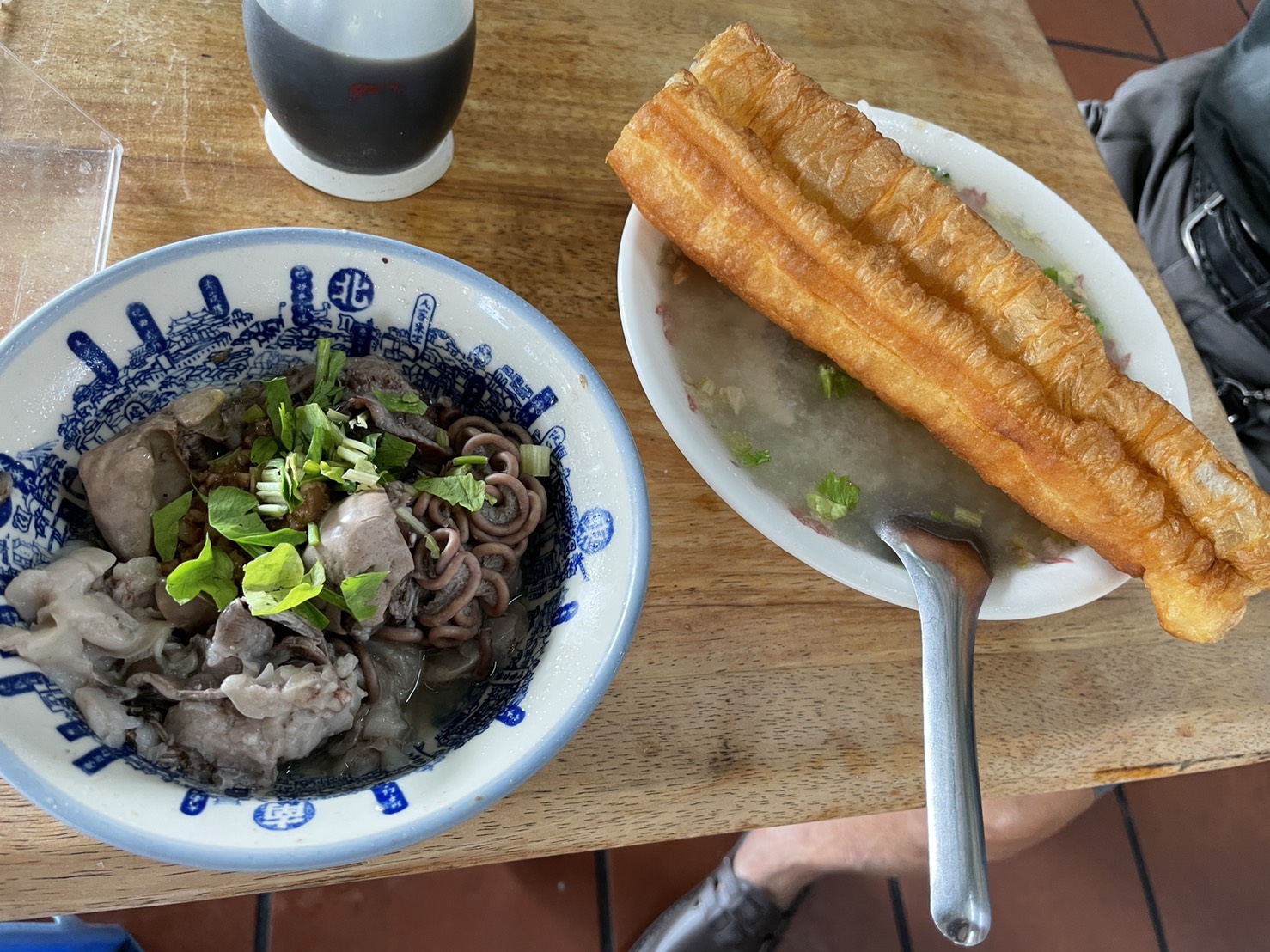 服務員端上桌的是,一碗虱目魚腸、一碗鹹粥配一根油條。我觀察並學習阿伯怎麼吃。