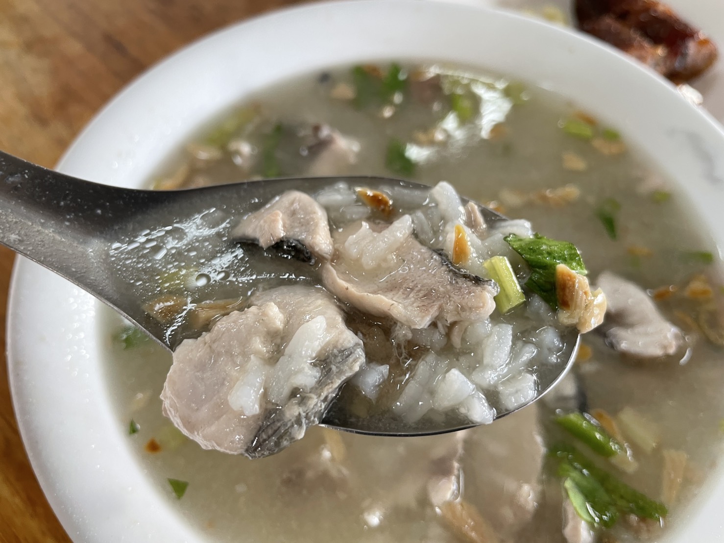 接著,舀一匙鹹粥,米粥混著些許虱目魚肉、蚵仔、芹菜、蒜頭和紅蔥頭。