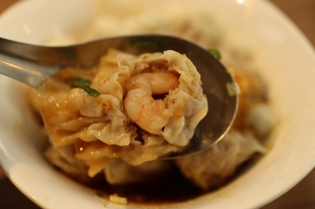 滿點的招牌就是大雲吞,有鮮肉跟鮮蝦兩種,但是個人偏好鮮蝦雲吞,雲吞皮薄,肉餡飽滿,蝦仁鮮脆,肉質緊實無腥味。還有就是真的「大」,在飯店自助餐也有紅油抄手,口味算不錯,可就只是小小的雲吞,說不定這小尺寸才是正常尺寸。可能是從小吃滿點大雲吞,有刻板印象,以為雲吞都是大顆的。
