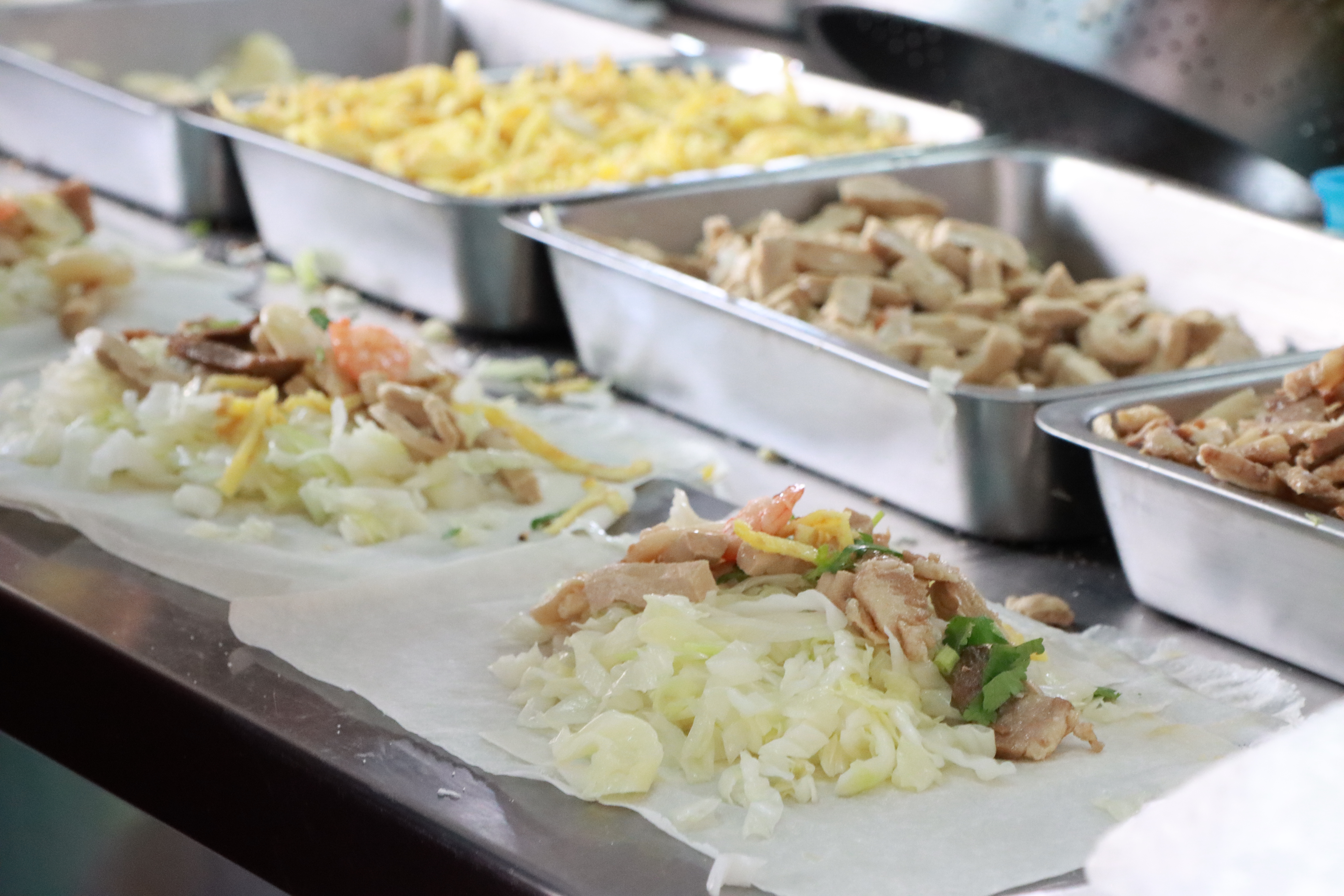金得春捲配料有高麗菜、蝦仁、蛋絲、滷肉(推薦半肥半瘦)、滷豆乾,看似簡單,備料卻繁瑣,雖然最後都是捲在一起,但是配料不能同時炒在一起,得一一準備。端午節時,媽媽會準備潤餅,雖然是簡單的食材,但備料繁複,所以只有一年一度才會準備。作為應景食物,清明節左右,金得春捲必定有長長的人龍,我倒不曾挑戰自己的耐心去排隊。幸好金得春捲平時可以方便享用到,無論當早午餐、下午茶或正餐皆可。