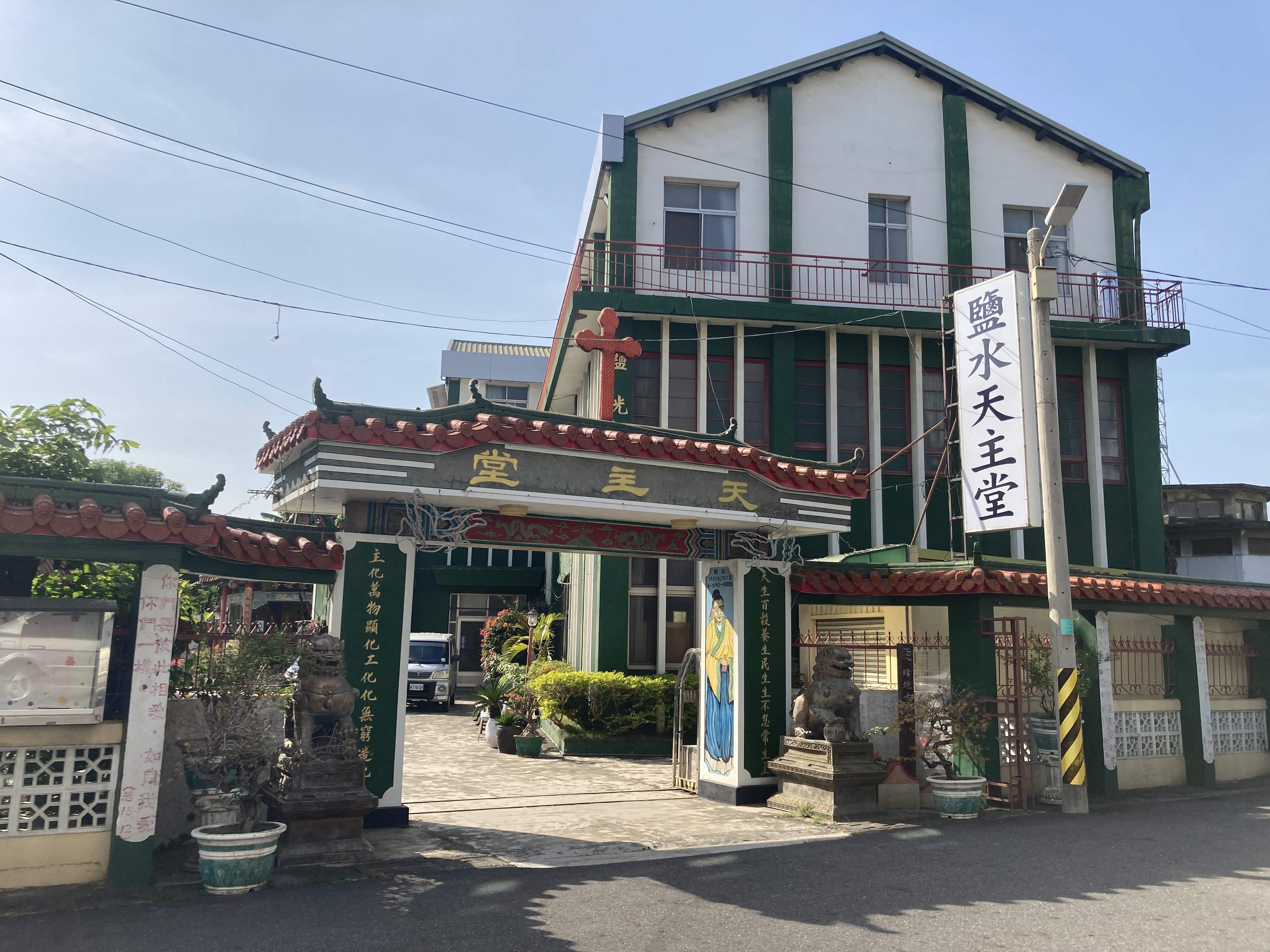 王爺廟巷的盡頭接壤西門路,走出巷口便能看見「鹽水天主堂」,這座中西結合的教堂。明明是聖經與耶穌的故事,牆壁彩繪人物卻有著東方臉孔與漢服,若非旁邊有一間「聖佳蘭隱修院」,真會讓人分不清楚究竟是教堂還是廟宇。