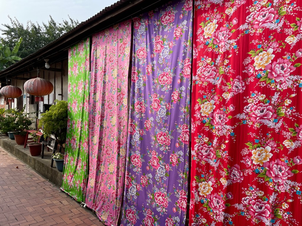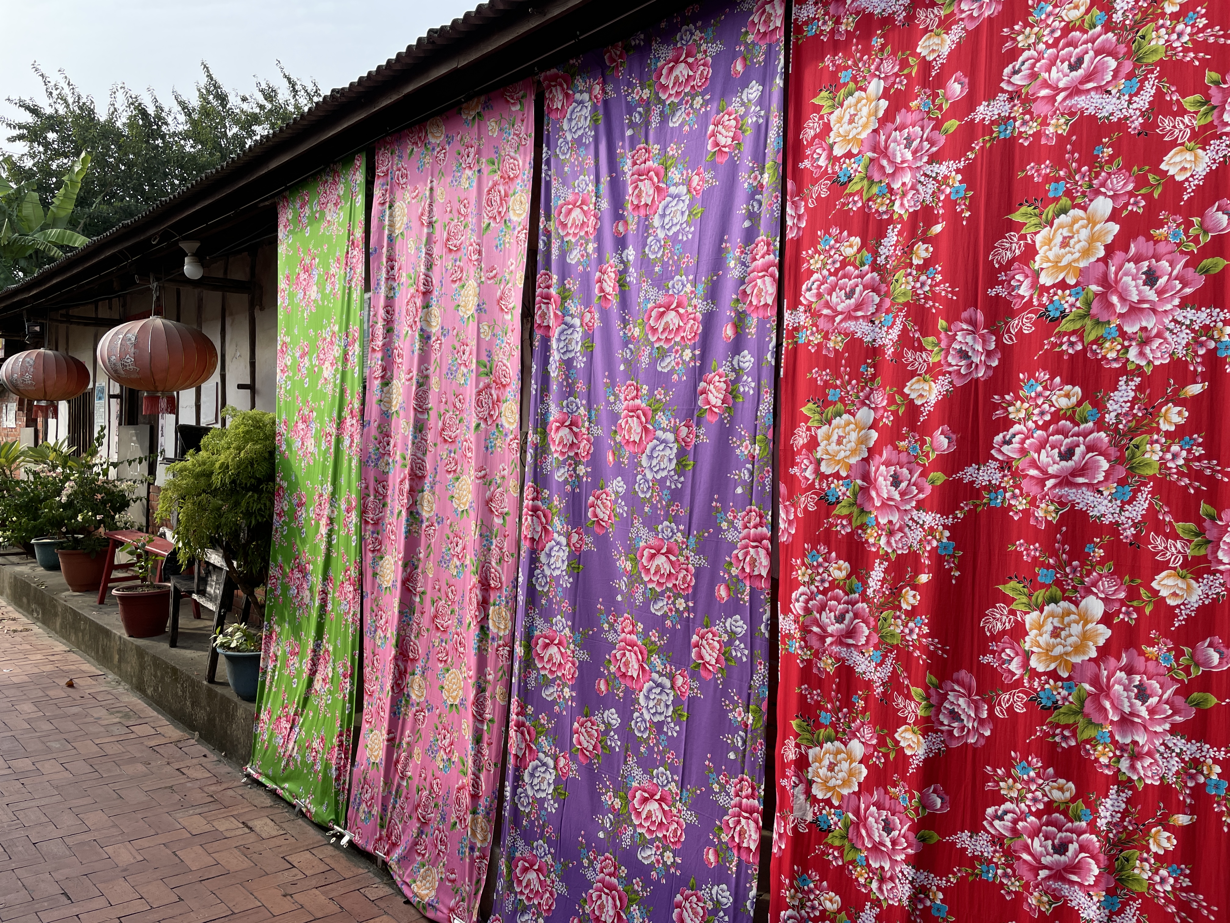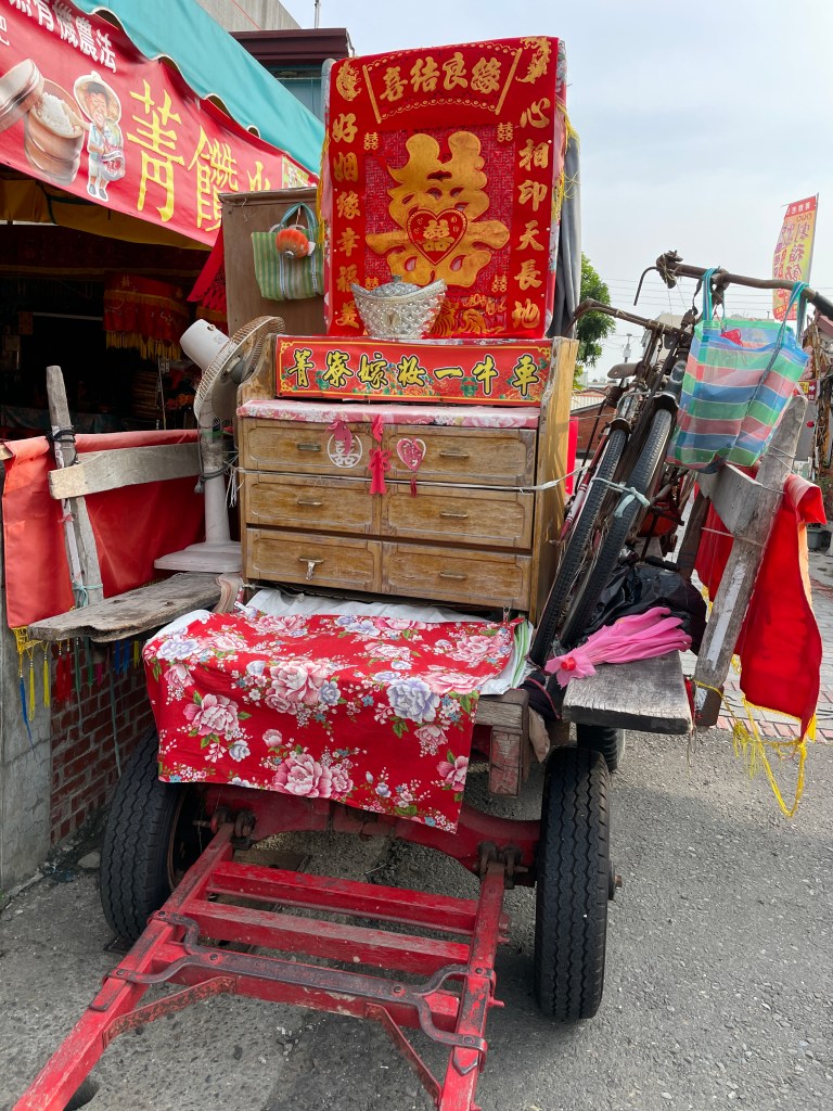 來到菁寮老街,就是要悠閒地慢慢走,台語諧音「稻稻來」,輕鬆寫意地體驗老派街道文化。老街入口的木造老屋,「和興冰菓部」是在地80多年的冰品老店,這裡可是阿公阿嬤那個時代的星巴克,說是當時最熱門的約會相親場所也不為過。隨意街邊的一個轉角,紅、紫、粉、綠四色的阿嬤花布,微風吹過,與一旁的農具及閩南台式老建築是那般契合;再轉一彎,看到街上停了一台傳統大紅花轎與牛車,牛車上放了斗櫃、妝台、臉盆、尿壺、西裝、孔明車⋯⋯真的是「台南菁寮嫁妝一牛車」;又再一個轉角,見一個廢棄老屋,搭上幾個老舊木頭、沙發、咖啡桌,成為老中帶潮的小天地。