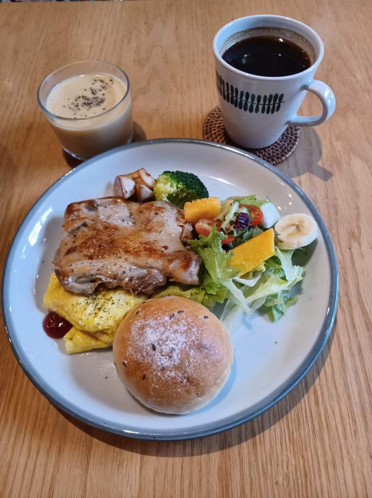 首先送上來的是美式咖啡,入口微酸,苦味少,整體來說溫順,在這平靜的早晨,細細品啜每一口咖啡,喚醒沉寂的大腦與感官。過沒多久,餐點也送上來了,吃正餐前,我習慣先喝湯,暖胃也助食物消化與吸收,玉米濃湯的香氣充足,味道也濃郁,入口全是玉米味,搭配研磨過的黑胡椒,拉升味覺層次。喝完湯,接著吃生菜沙拉,新鮮爽脆的蔬菜搭配鹹香胡麻醬,白芝麻的香氣讓沙拉口感變得豐富,吃不完的胡麻醬可以搭著炒蛋一起吃,蛋香和芝麻香在嘴裡化開,別有一番滋味。