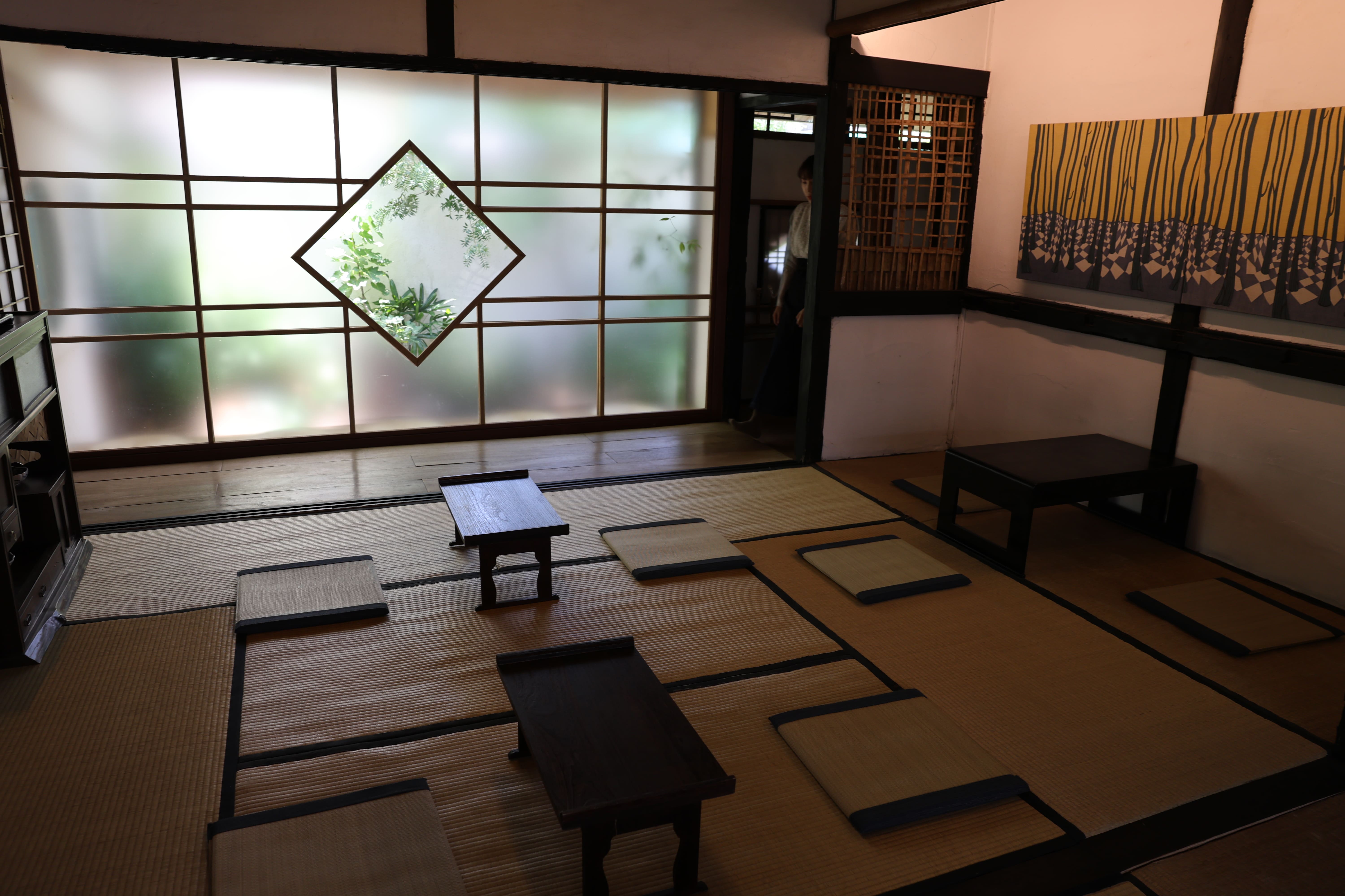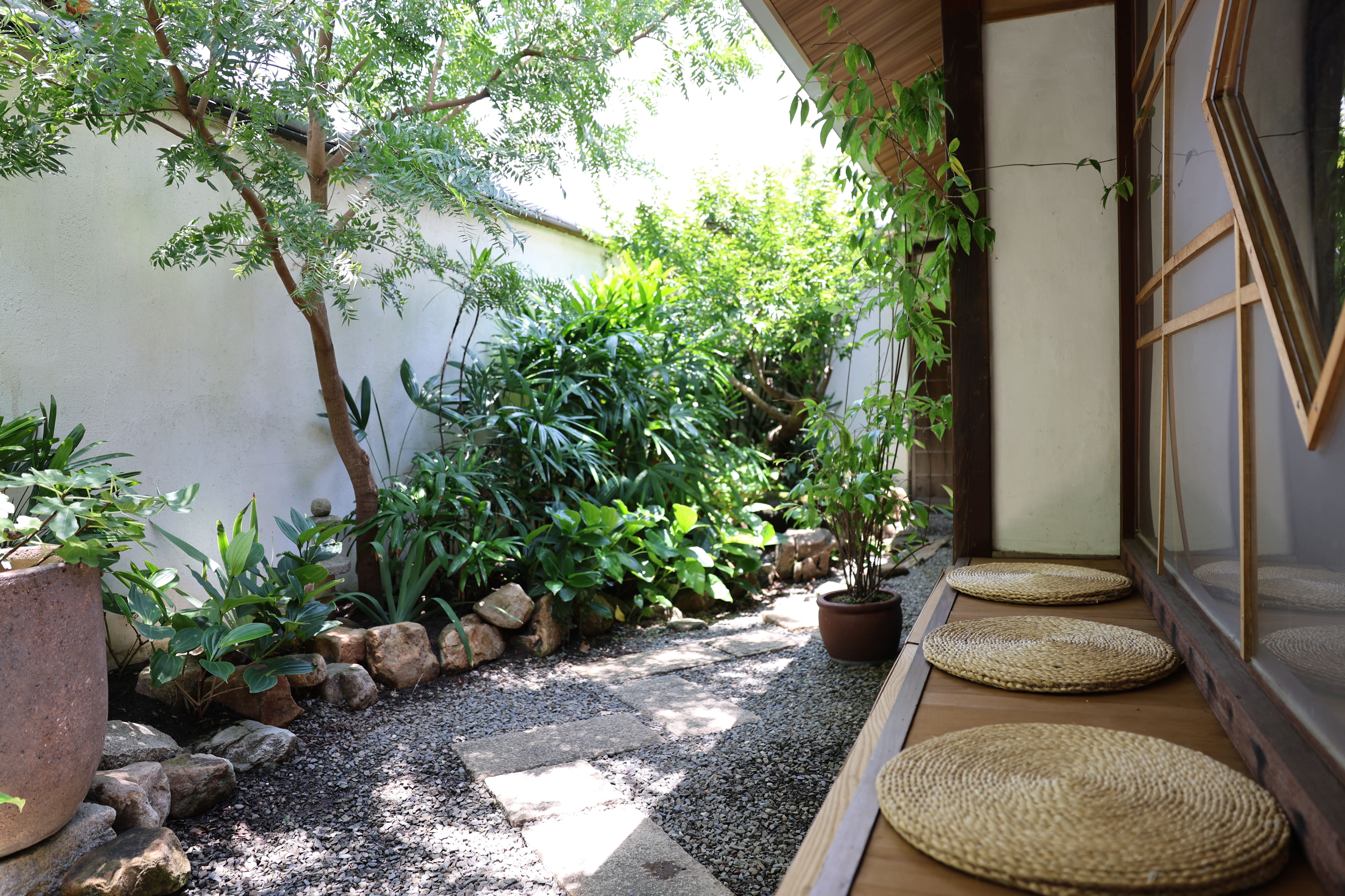 霧色毛玻璃拉門開了稜型的木窗,把小小庭院框成了一幅畫。通過走廊,是一大片透明玻璃拉門,若說剛才是掛在牆上的畫,如今是整面牆的巨幅畫作,有時是靜物畫,有時隨風輕顫成了動態畫,拉開拉門,人就進到了畫中。可坐在迴廊上欣賞綠意盎然的小庭院,背後是霧色玻璃,為背影留了一份隱密,多了一份逍遙自在。