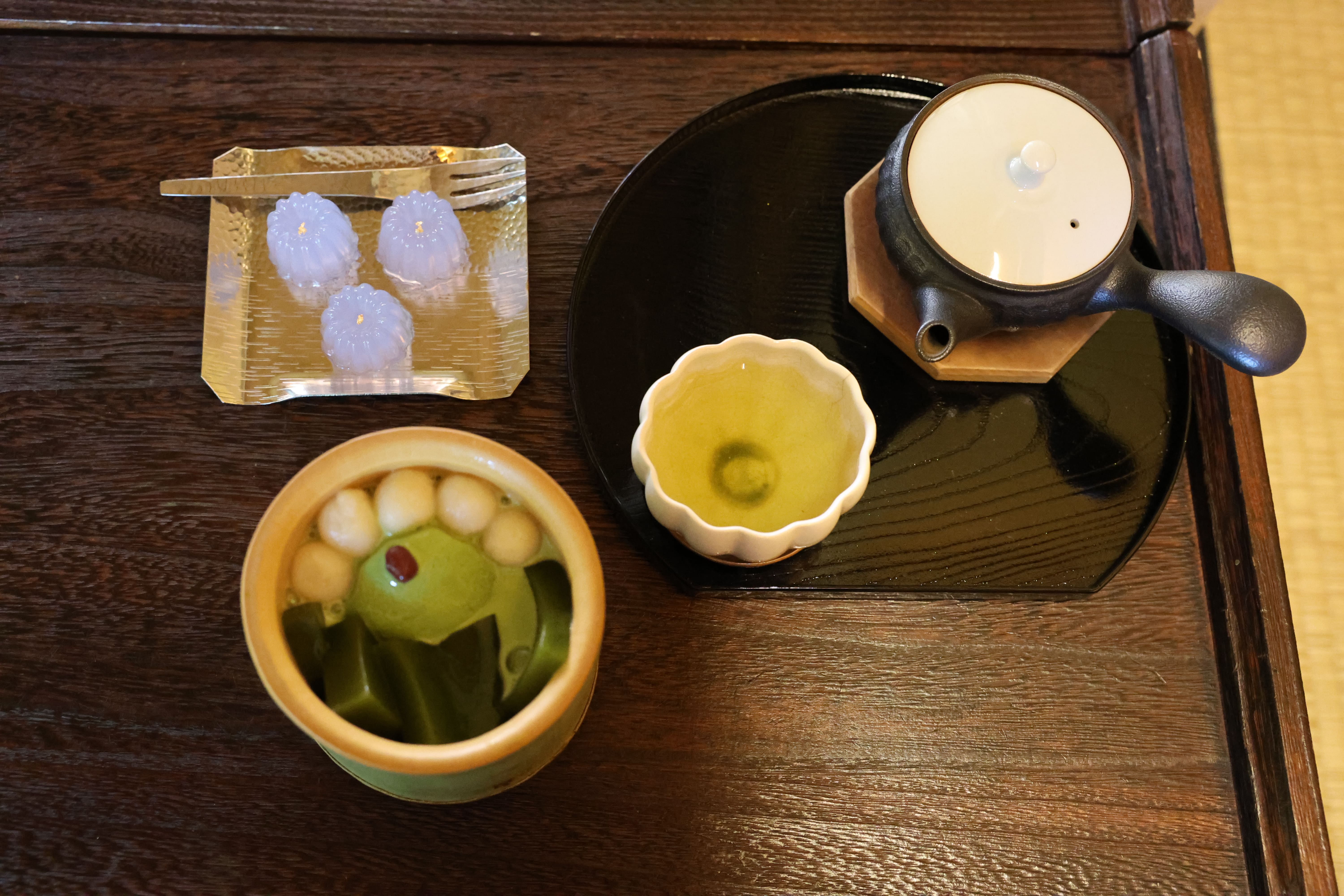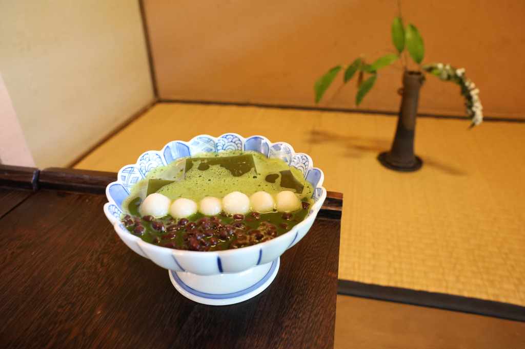 特地選了壁龕旁的位置,上方掛著花草的水墨畫,底下擺著葉材為主角的日式插花。不久餐點上桌,竹筒內是加了抹茶冰淇淋的抹茶宇治金時,為一般常見的組合。高腳蓮花白瓷盤盛放的薄茶宇治金時,則是第一次嘗到的傳統口味,底下刷了一層薄抹茶,上面擺著顆粒分明又綿密的小倉紅豆及一塊塊抹茶凍,中間隔著一排圓潤可愛的白玉糰子,少了鮮奶油製成的冰淇淋,似乎更能感受抹茶的苦澀、紅豆的甜蜜及彼此的相得益彰。