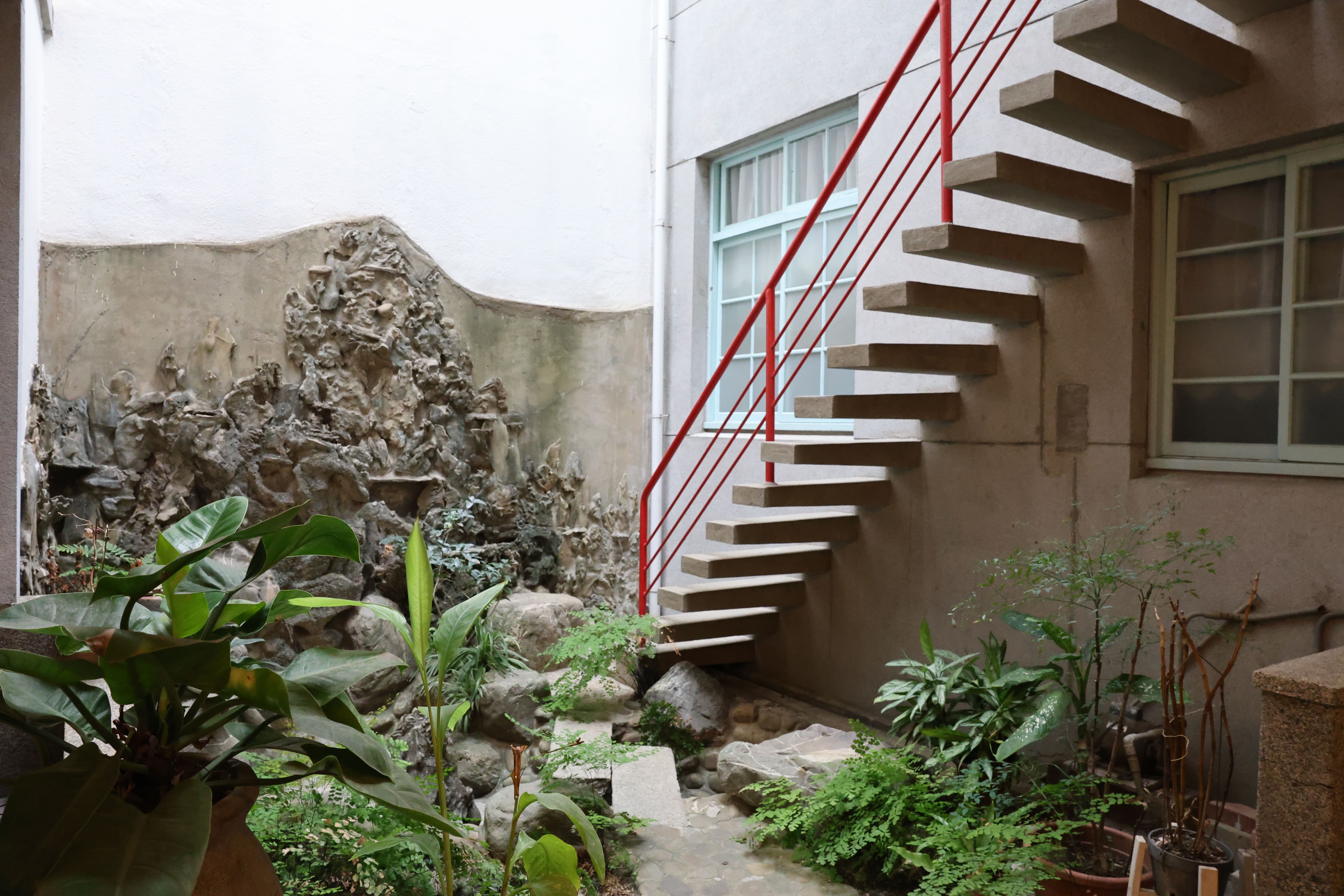 一樓的中庭是石頭造景,最特別的是直接崁入水泥牆的樓梯,階梯間沒有連結,只有欄杆扶手,現今已很少見。中庭後方是四間產婦休息間,淺綠門上貼著號碼牌1、2、3,唯獨少了不吉利的4, 小細節透露出老醫生對產婦的用心。現今病房的病床已不復見,典雅木櫃木椅是重新上漆修復, 一盞懸掛的老油燈點亮了靜謐的氛圍。