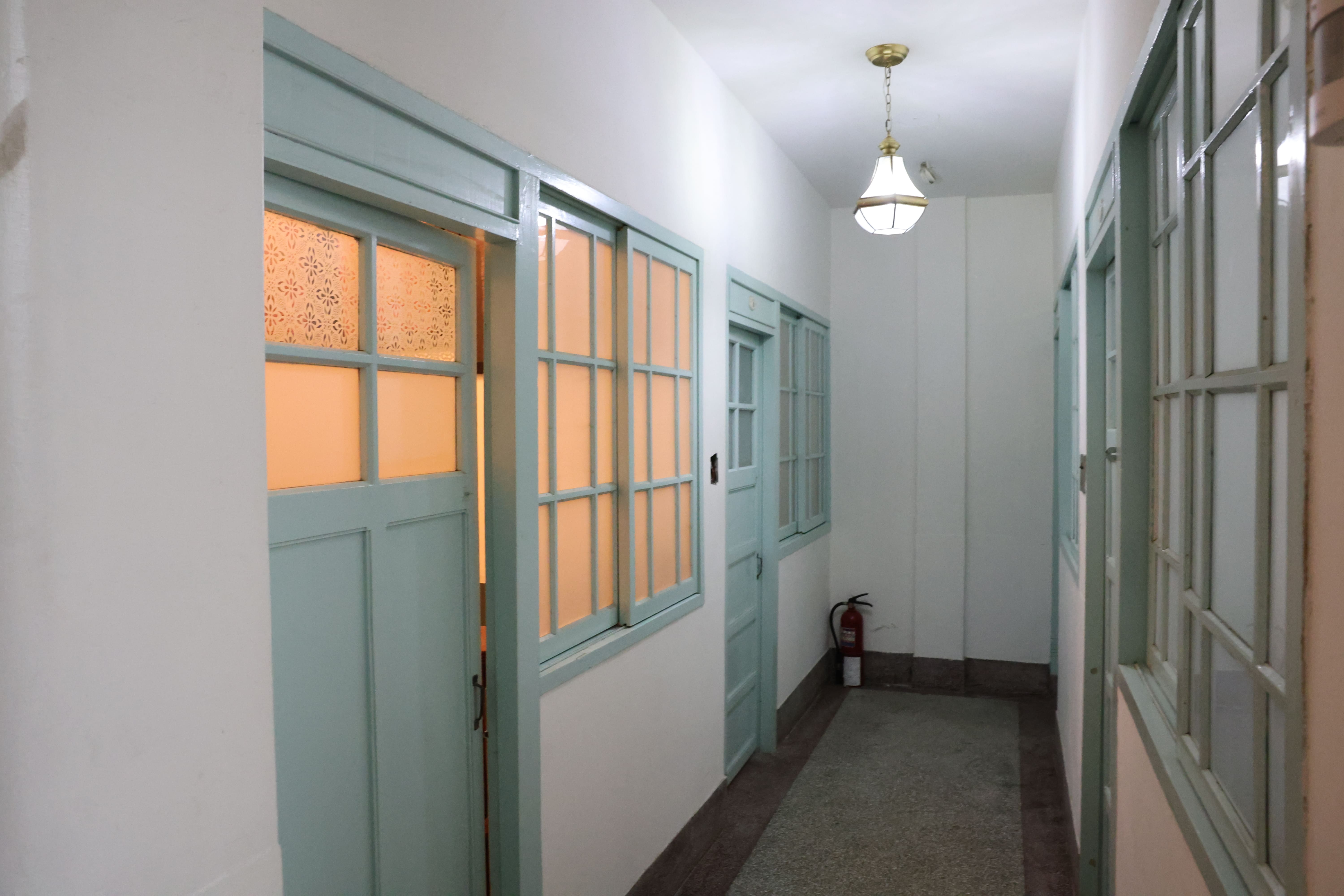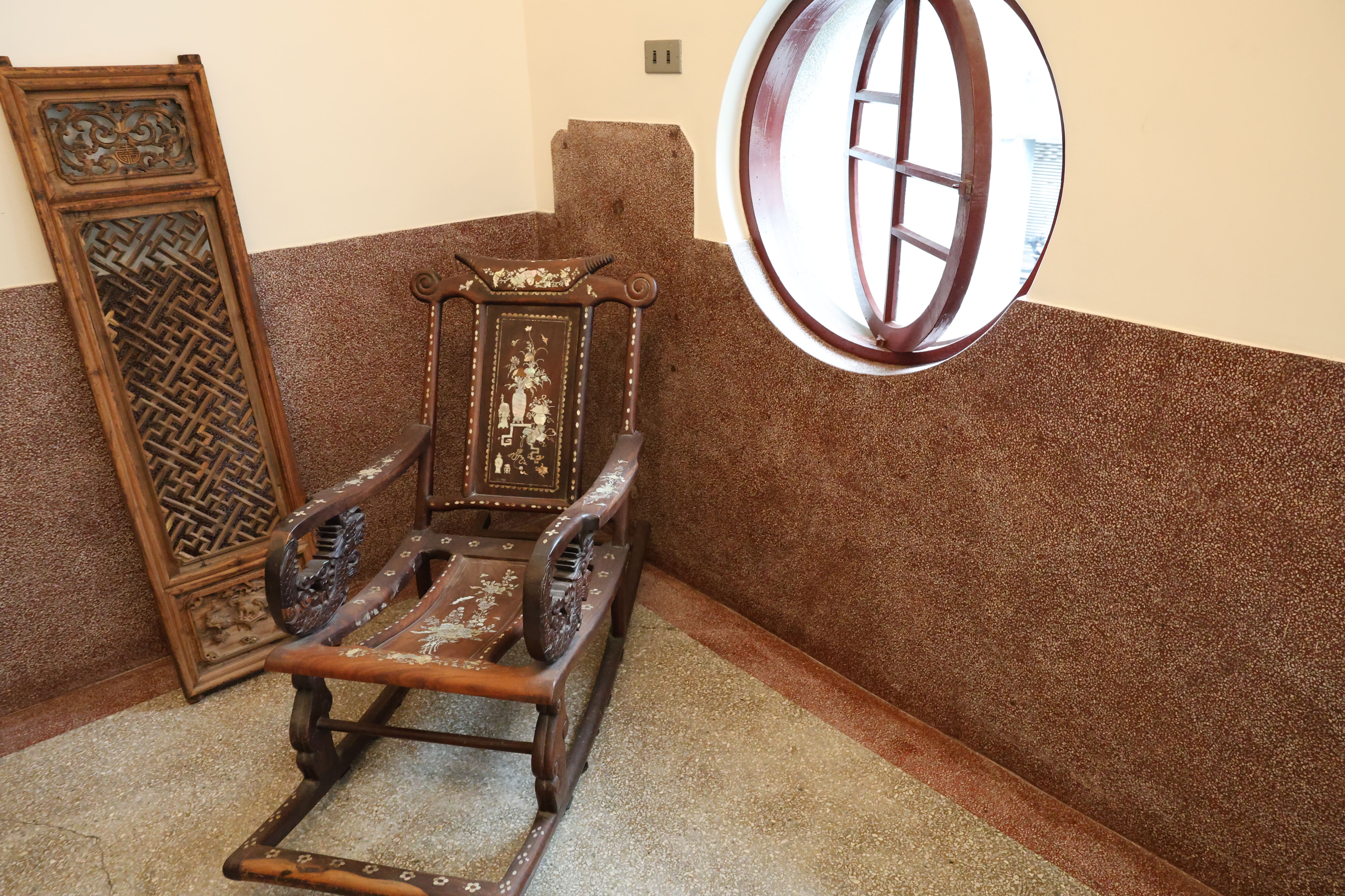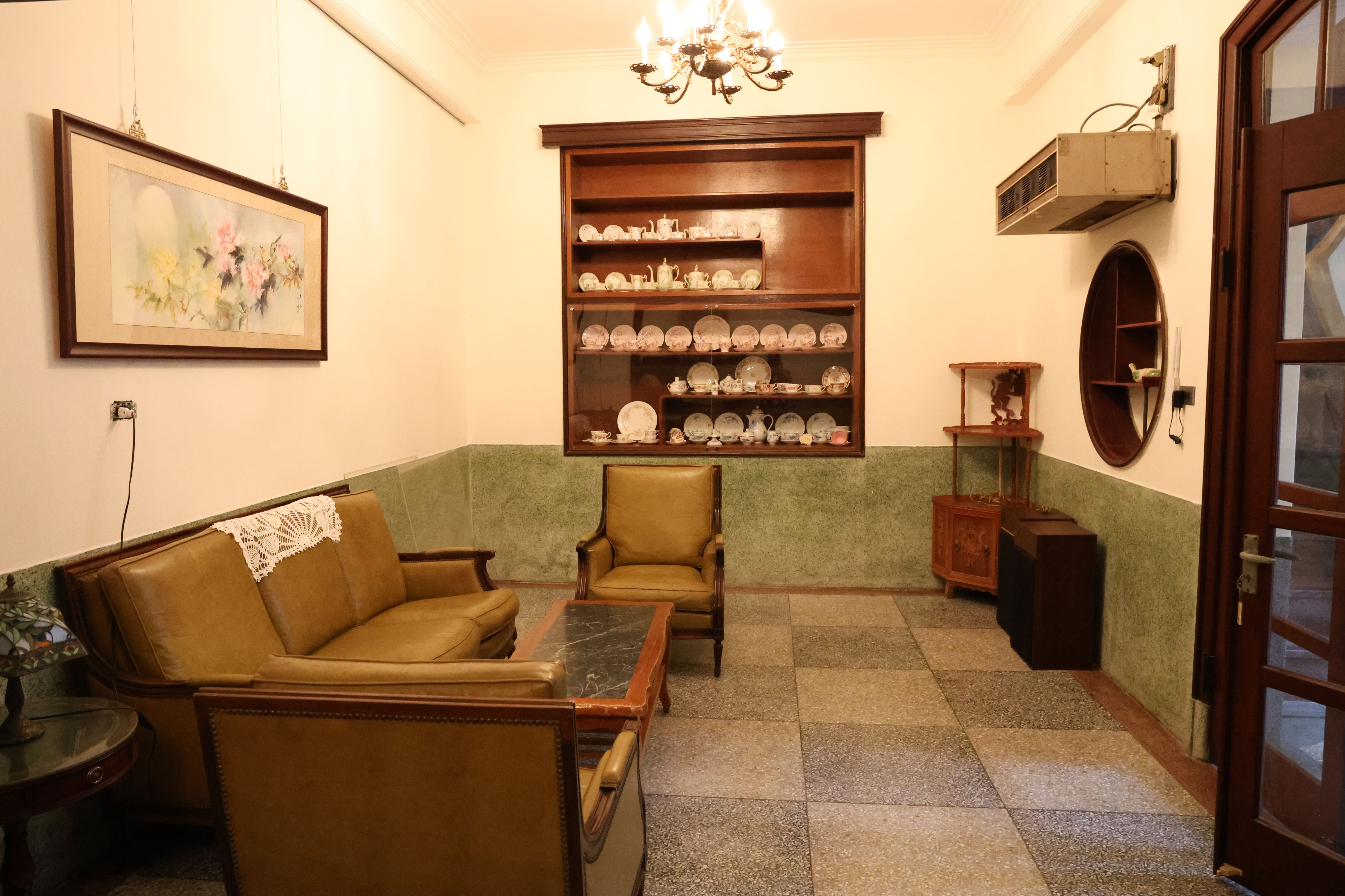 來到二樓,一入眼的是素雅的客廳,還保留著舊型大長方形的鐵灰色Panasonic國際牌冷氣機。後方是以前老醫生三位千金的閨房,日式檜木thàng suh(簞笥)櫥櫃是釘在壁裡,深度很深,也有刻意做高的簞笥用來放棉被。最大的房間裡,有一根水泥柱在轉角處,因為當初為了保留L型的窗戶,才把支撐的水泥柱建在房裡,如今也是這間最大的特色。另一特別的是圓形木造窗,半開的木窗,窗下一把搖椅,檜木簞笥,一座屏風,靜觀著歲月。二樓另一邊有個教室,原本是老醫生的寢室,現在是舉辦咖啡講座的地方。打開窗戶還有驚喜,可以看到對面的古老的竹編泥夾牆。