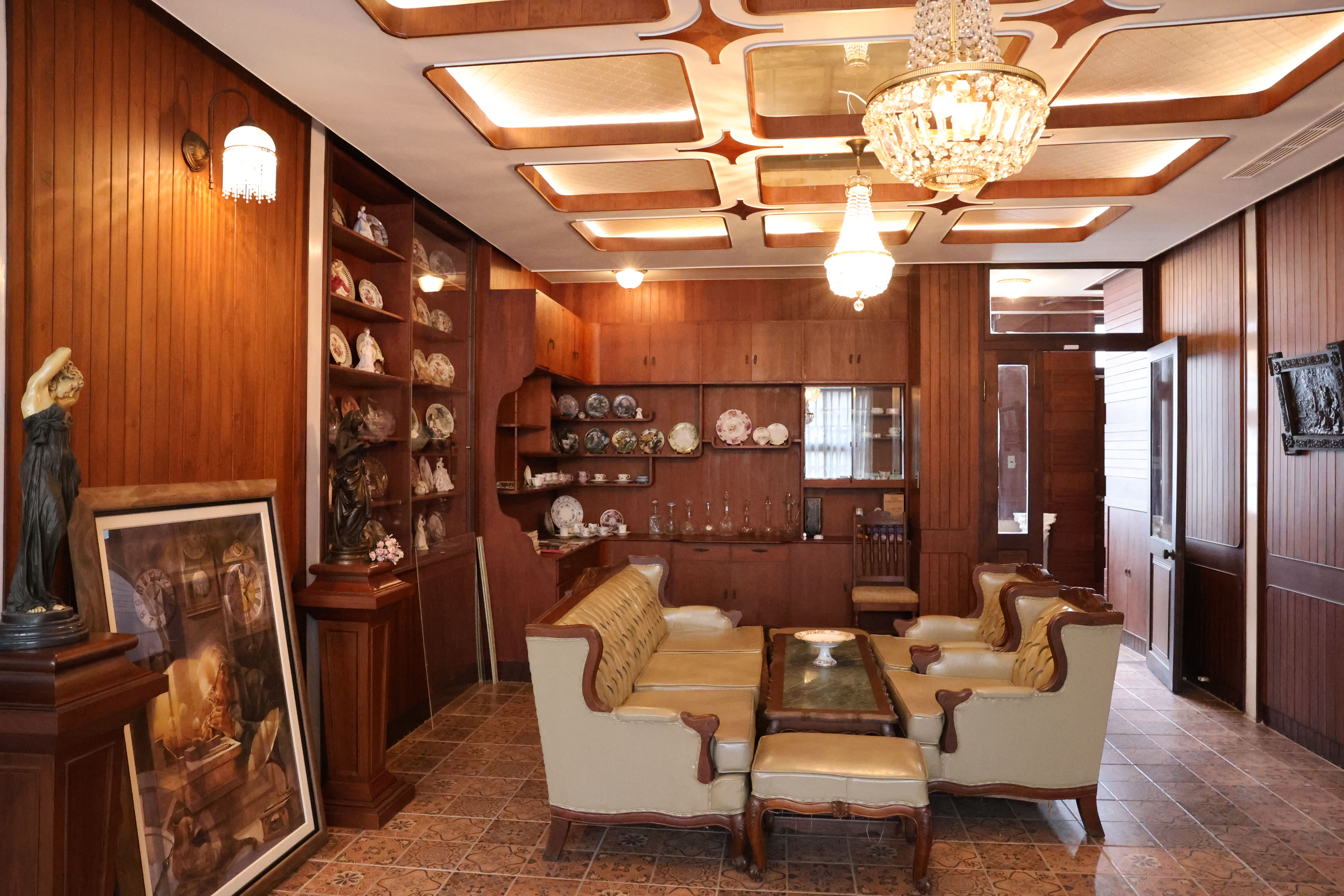 來到三樓的大客廳,彷彿是歐式沙龍,典雅大氣的真皮白沙發,重新鋪上的復古磁磚地板,一整個牆面的原木展示櫃收藏著女屋主精挑細選的歐洲瓷器茶具,窗邊也擺放著歐洲油畫及優美的雕塑品。另一牆面是格柵式檜木牆,掛著女屋主收藏的銅版畫,至今已有130的歷史,描繪著春夏秋冬四季的故事,文人雅士之好。抬頭更是驚喜連連,法式線版鑲嵌的大塊透明壓克力,看到老屋日式檜木的三角屋頂,真是巧妙的設計。另外兩間以前是老醫生兩位公子的寢室,其中挑高的一間,可以直接看到特意修復的日式屋頂一部分。