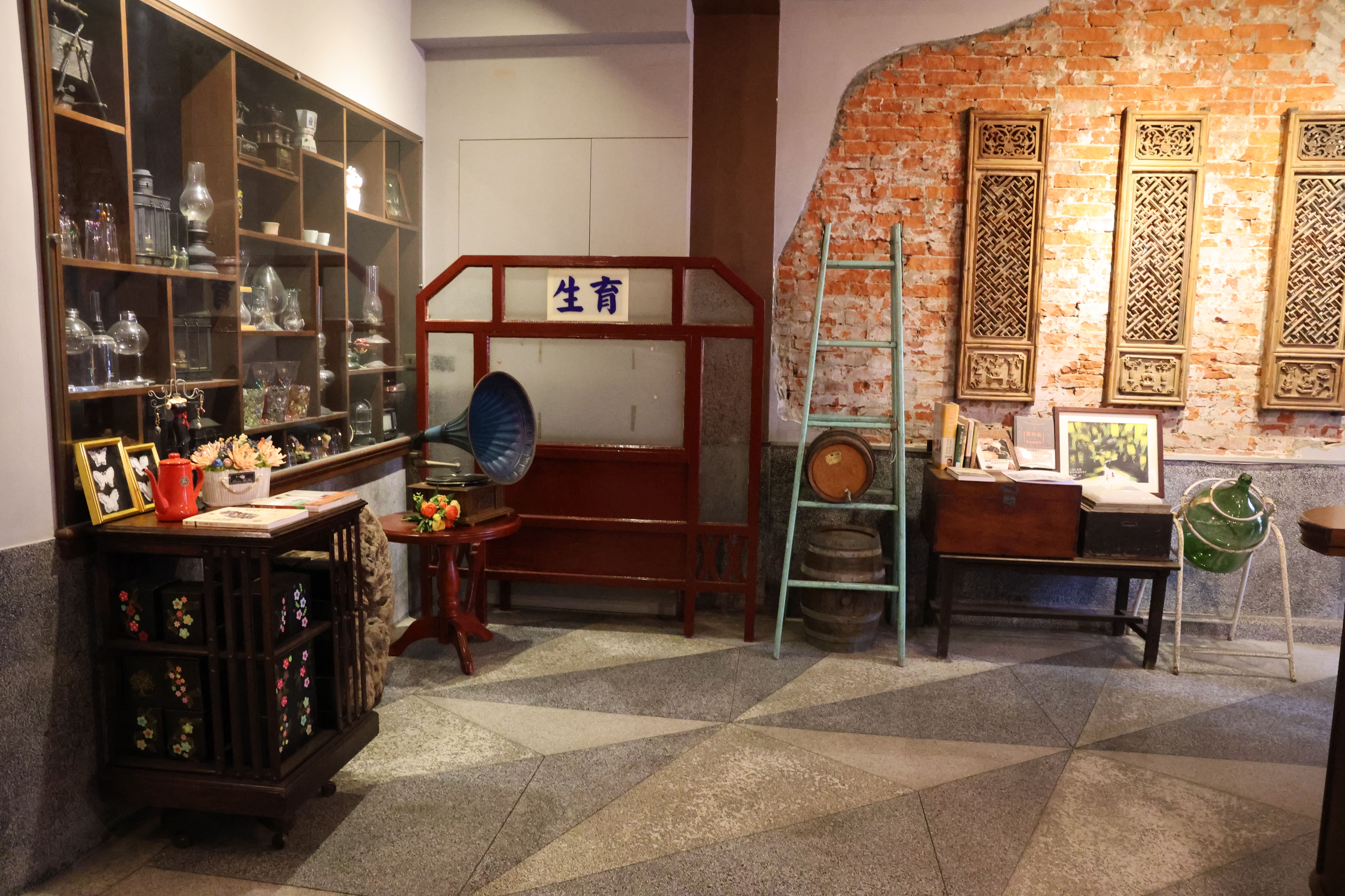 位在舊城區的這棟三層樓老屋,前身是「育生婦產科」。民國48年開始營業,一樓是診所,二、三樓是老醫生及家人的起居室。從門口進入,左邊是時髦咖啡吧台,右邊有一大塊裸露的紅磚牆面,透露著歲月痕跡,底下放著日式小火爐,是以前烤小魚乾用的,很像日劇阿信場景中會出現的實物。轉角處的診間屏風,左到右讀「育生」,右到左讀「生育」,不言自明「育生婦產科」。一旁的留聲機是女屋主的收藏,黑膠唱片的樂曲飄出,歐洲彩繪老油燈散發暈黃燈光,女屋主比劃當時看診、抓藥及屏風的位置,彷彿進入了一場時空之旅。