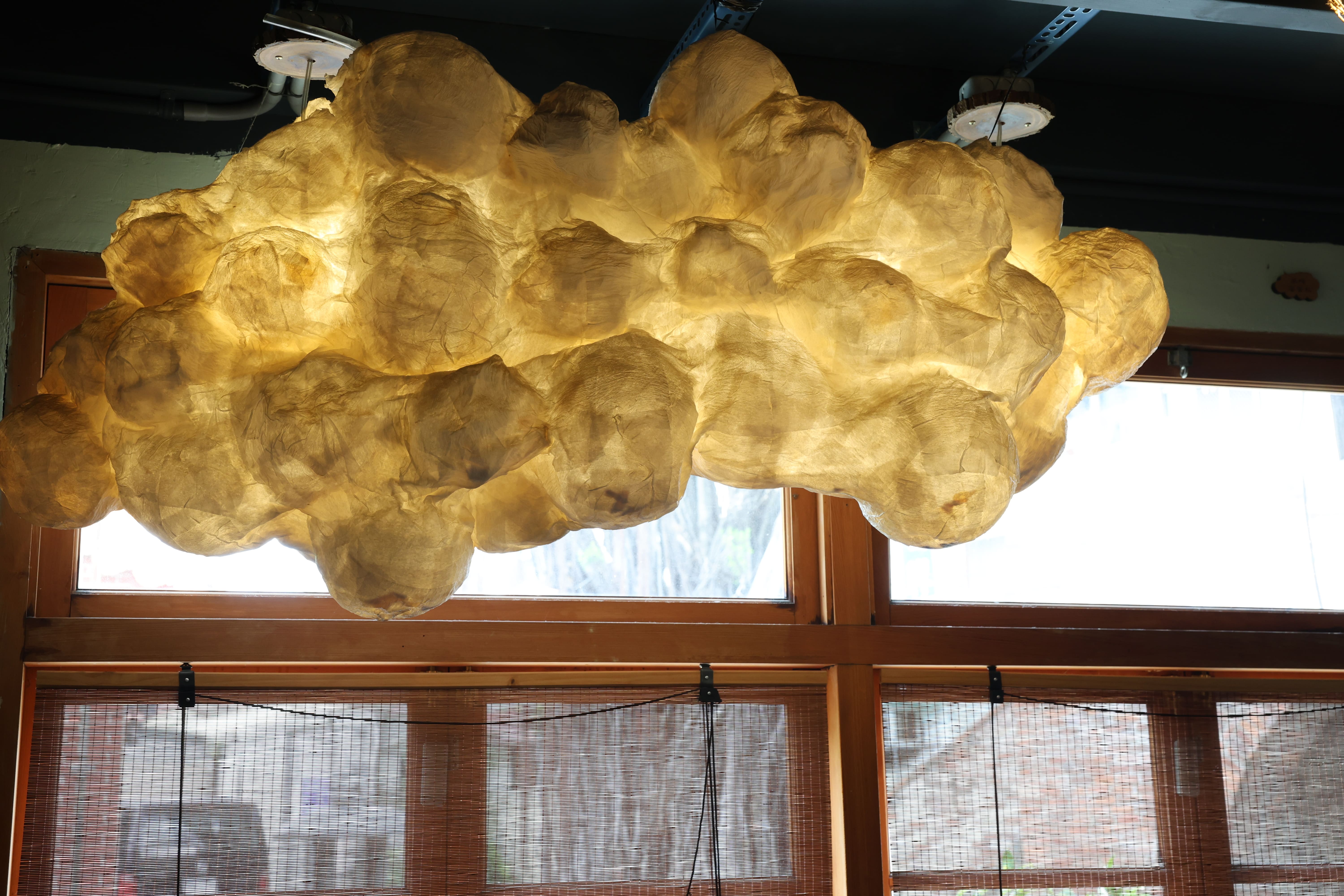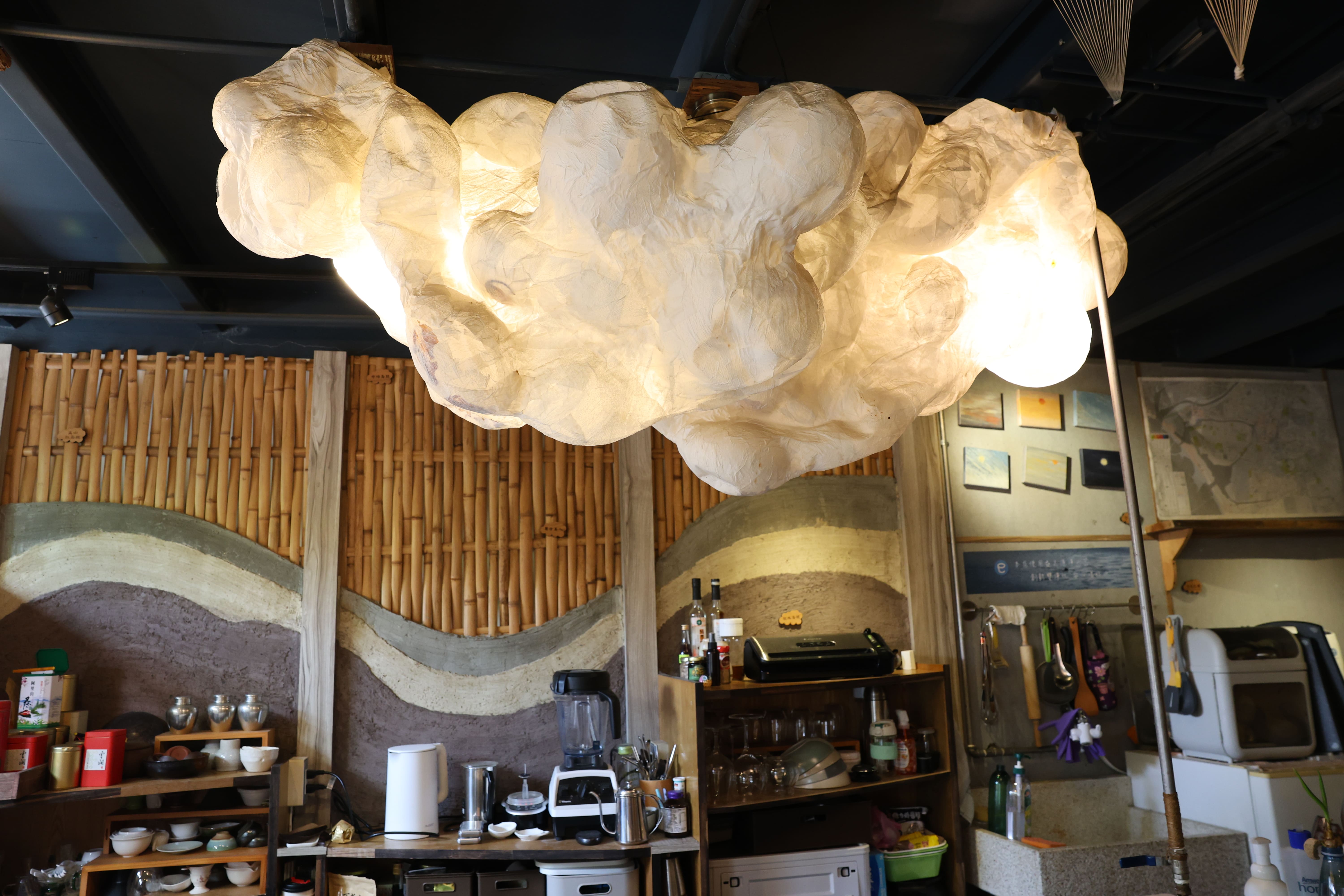 老古石渡除了民宿空間,靠街的一樓是雲澗茶坊,只有舉辦活動預約才能進入,茶空間不大,但Emily希望在設計上帶給人遼闊感。茶一字打開來,即人在草木之間,草木泛指大自然,因此茶空間希望呈現人在微型天地之間喝茶的概念,腳踩著地,頭望著天,主燈是一盞雲燈,象徵著天,窗邊是另一盞雲燈,夜晚亮起,意象是點一盞燈等回家的人。