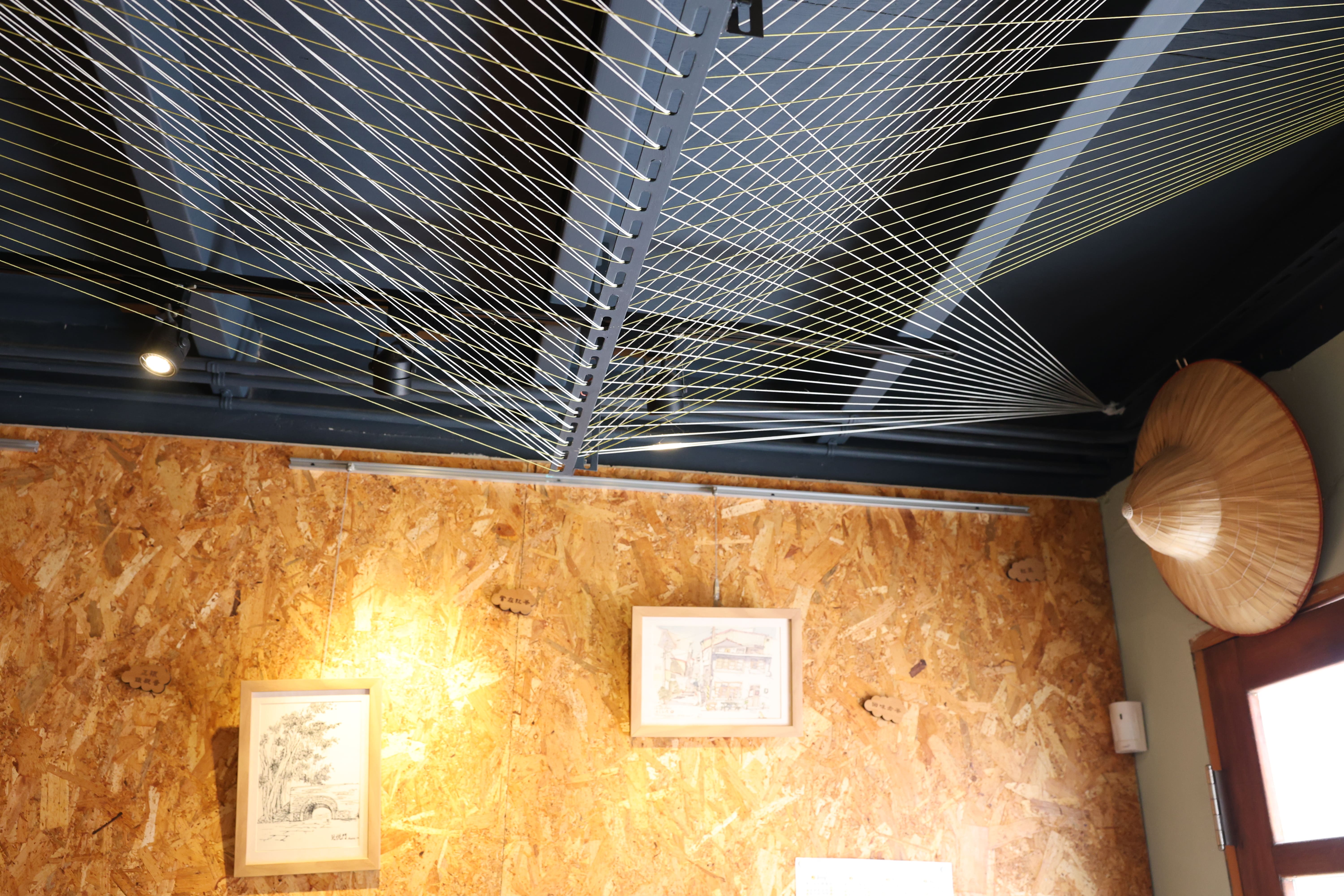 廚房吧台後方的牆解構早期建造工法的竹編泥夾牆,並描繪著層層疊疊的遠山。頭頂上方使用空間編織,用實際的線呈現光線,光線發射交會之處為玄關,當大家踏進這個空間,就是願意打開自己內心的光,與別人的光交會交流。Emily作為雲澗茶坊的伺茶人,之後預計在茶空間舉辦茶嬉玩茶的活動,以茶會友,另外也會有參觀介紹民宿的活動,讓大家更認識老古石渡。