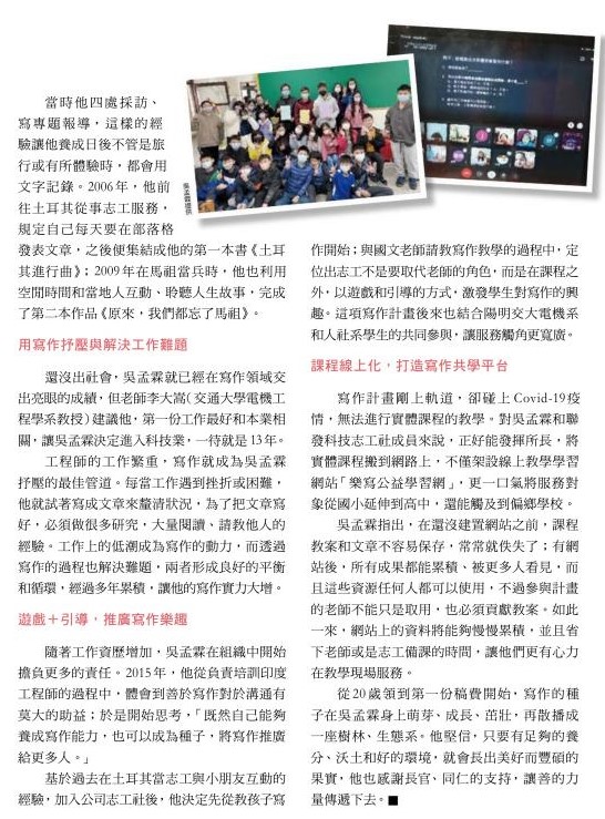 本業是科技公司工程師,副業是寫作志工,吳孟霖(電信系95級)用本業專長創辦線上學習平台 「樂寫公益學習網」,結合企業員工、學校教師和學生志工的力量,將寫作種子散播到更多角落。