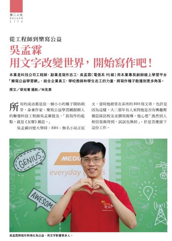 所有的成功都是從一個小小的種子開始萌芽,身兼作家、樂寫公益學習網的聯發科技工程師吳孟霖提及,「我寫作的起點,就是《友聲》雜誌。」