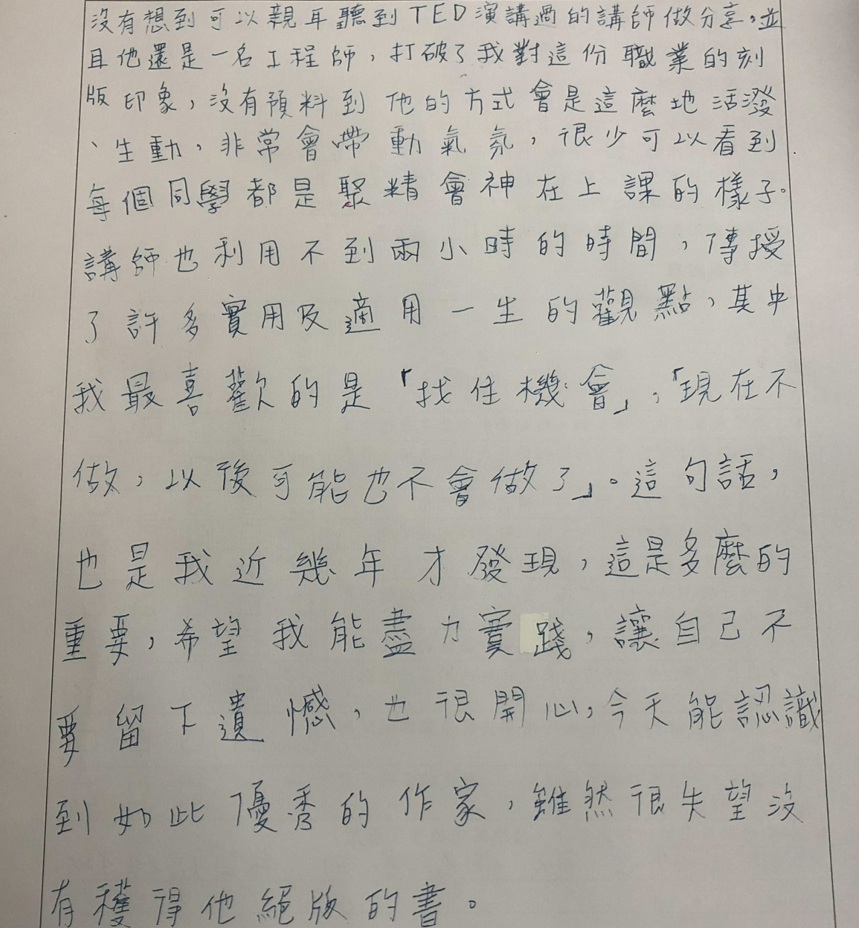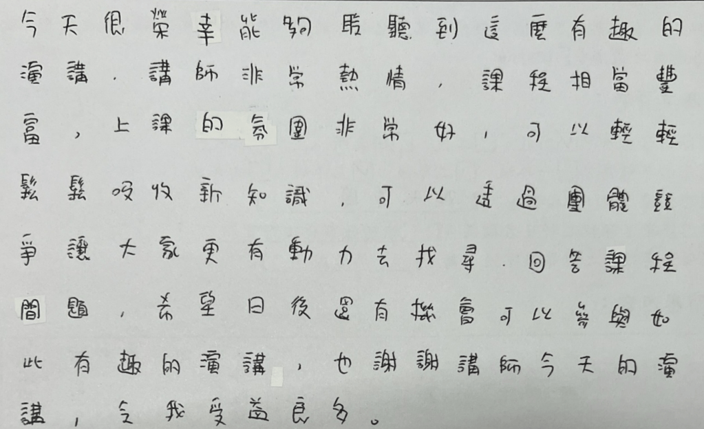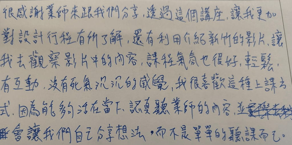 這是我第一次上完大學生的課之後收到手寫回饋。
