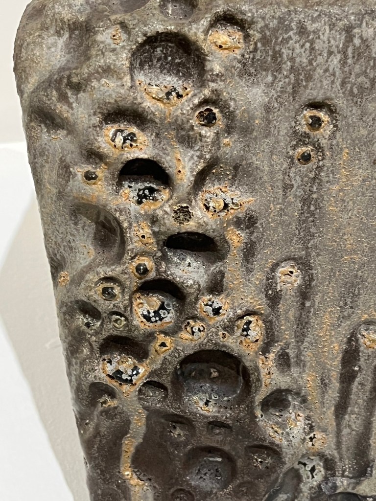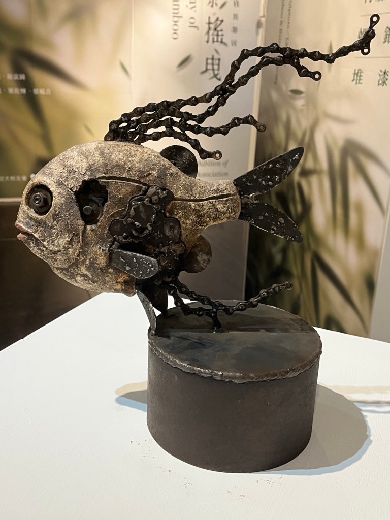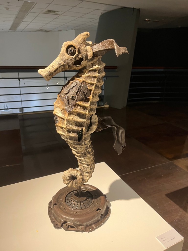 看完所有作品,我對於展場所有工藝家的手法和創作理念,由衷感到佩服。其中令人印象最深刻的是──林時植老師的作品「異域」。根據導覽員的解說可以知道,林時植老師的「異域」系列,大部分是採用陶土和現成金屬物為材料,有些甚至是在回收廠檢來的廢棄物,以現代性創作手法與海洋生物為主題,傳達對於地球、海洋及宇宙的環保議題。
