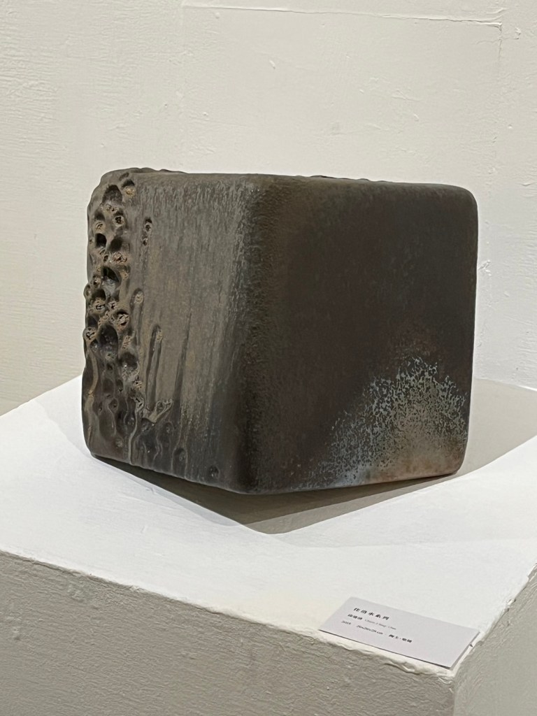 剛走進展場,就被那些獨特的工藝品給吸引。經由展覽方的導覽員協助導覽,我漸漸了解工藝家們創作的內涵,與作品裡展現的獨特之處。沈培澤老師運用木塊的原始形狀為主體,不過度雕琢,以生命動力為靈感,創作出名為:「蛻變」、「誕生」、「歸」的木雕作品;邱建清老師以台灣海岸為創作靈感,展現年少時在宜蘭海邊生活的記憶,成為一系列「佳洛水」作品,運用陶土、柴燒等精湛的技巧,彷彿把受海水侵蝕堆積的海岸搬到展場一般;邱泰洋老師使用花崗岩進行石雕,以抽象簡約方式呈現作品的形體;許明香老師以寫實的手法創作仿真陶塑,融合個人經歷,創作出許多生活常見用品,如包包與高跟鞋;蔡佐燁老師以陶瓷創作出生活中常見的容器,有別於傳統只專注於藝術感的陶藝作品,老師更專注於生活上的實用性,希望回歸質樸的生活創作。