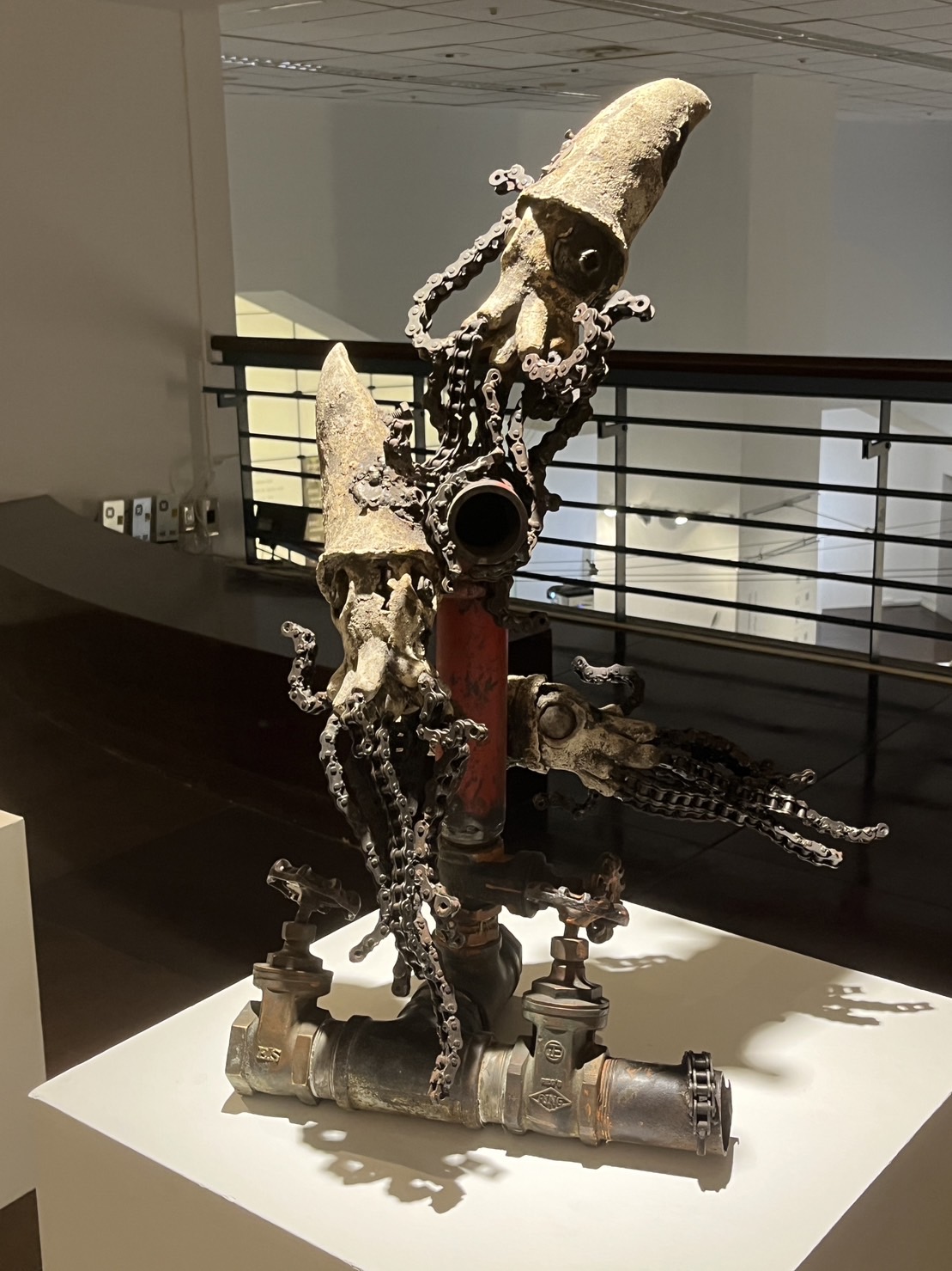 老師希望透過作品傳遞人們應重視對環境的保護,讓世界上的生命以及您我後代的子孫們,免於受環境變化影響。其在作品中運用陶土製作生物身體,並加入一些生活中常見的廢棄金屬材料進行組合,我看到:腳踏車車鍊做成的魚鰭、螺絲帽做成的魚眼睛,甚至還有以瓦斯管線做成的動物們圍繞之支架。使我不禁感嘆,若世界再繼續受污染下去,是不是未來的生物就必須面臨這樣的窘境呢?不僅是受污染的海洋,還有無法再延續的生命,再再令人憂心。