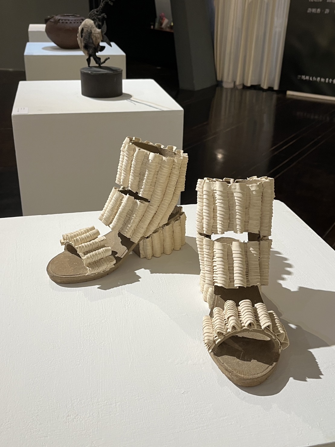 剛走進展場,就被那些獨特的工藝品給吸引。經由展覽方的導覽員協助導覽,我漸漸了解工藝家們創作的內涵,與作品裡展現的獨特之處。沈培澤老師運用木塊的原始形狀為主體,不過度雕琢,以生命動力為靈感,創作出名為:「蛻變」、「誕生」、「歸」的木雕作品;邱建清老師以台灣海岸為創作靈感,展現年少時在宜蘭海邊生活的記憶,成為一系列「佳洛水」作品,運用陶土、柴燒等精湛的技巧,彷彿把受海水侵蝕堆積的海岸搬到展場一般;邱泰洋老師使用花崗岩進行石雕,以抽象簡約方式呈現作品的形體;許明香老師以寫實的手法創作仿真陶塑,融合個人經歷,創作出許多生活常見用品,如包包與高跟鞋;蔡佐燁老師以陶瓷創作出生活中常見的容器,有別於傳統只專注於藝術感的陶藝作品,老師更專注於生活上的實用性,希望回歸質樸的生活創作。