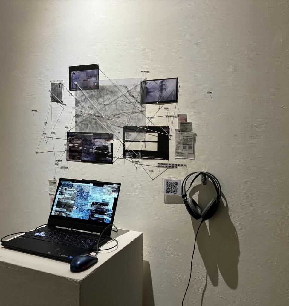 《交涉在差異間遊蕩》是我第一個觀賞的作品,釘在牆上的地圖與照片、在之間穿梭的棉線,塑造出疑雲重重的意象。作品的主體是筆電中顯示的介面,觀者可以透過點選播放各種白噪音以及陌生人的說話聲,最有趣的部分是現場也歡迎大家提供自己的「聲音」供人聆聽。