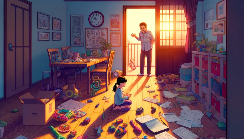 在一個陽光明媚的下午,小文從學校放學回家後在房間中玩耍。玩具散落一地,但她的作業卻一字未動。時鐘的指針無聲無息地轉動,天色漸暗,小文沉浸在自己的世界裡,忘記了應該完成的作業。