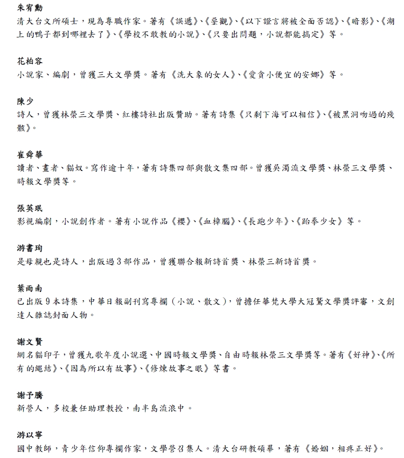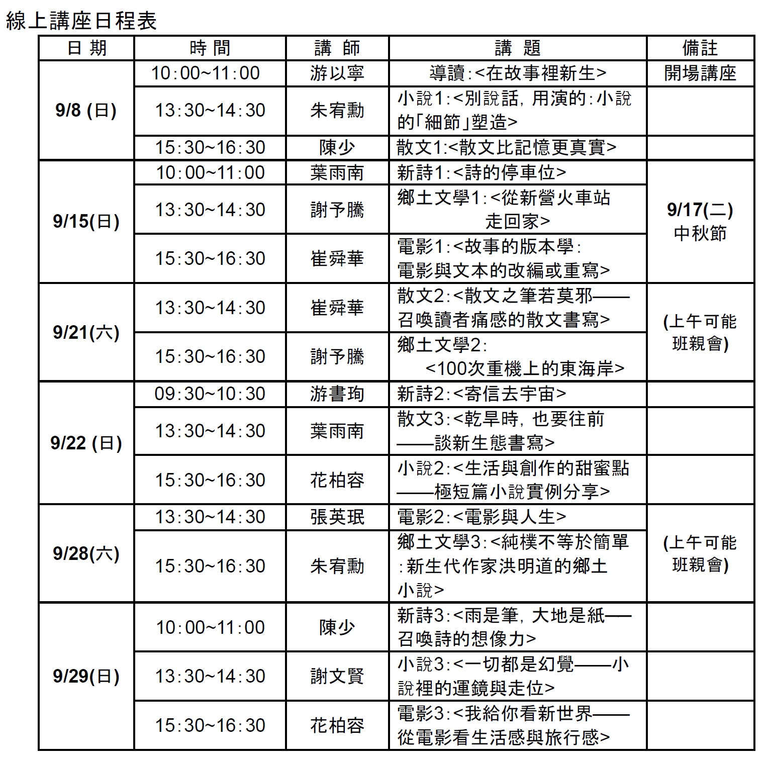 組別及場次: 此次線上文學營分5組(新詩、散文、小說、電影、鄉土文學),每組3場次。另有一場開場講座,合計16場次(線上講座每場1小時)。