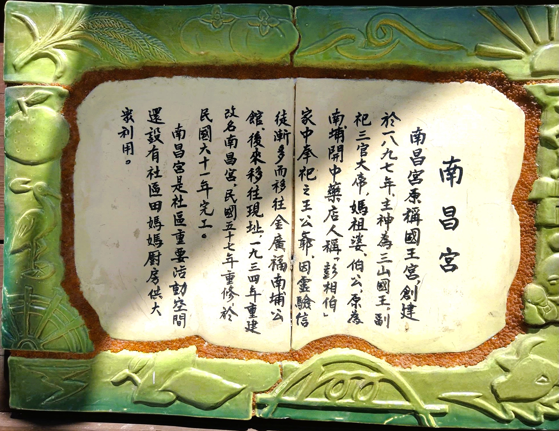 南昌宮創立於1897年,是南埔村的信仰中心,主祀三山國王,副祀三官大帝、媽祖和伯公。南昌之意,為祈願南埔村昌隆昌盛。單殿式的南昌宮,座落在田野之間,廟埕空間開闊,緩緩穿越田埂小路,遙望山稜曲線,佇足伯公大樹下,嗅聞四季稻香,諦聽林間鳥唱,隨著徐風陣陣,時間的輪軸漸漸靜止,融入眼前的農村風光,採集南埔流淌百年的音符,先民拓墾的艱辛,前人耕讀的悲欣,老農修圳的堅持,數不盡的步伐交替踩踏,沈重如鉛字鑄印在這片土地上,吟唱著南埔定靜的田園古詩。