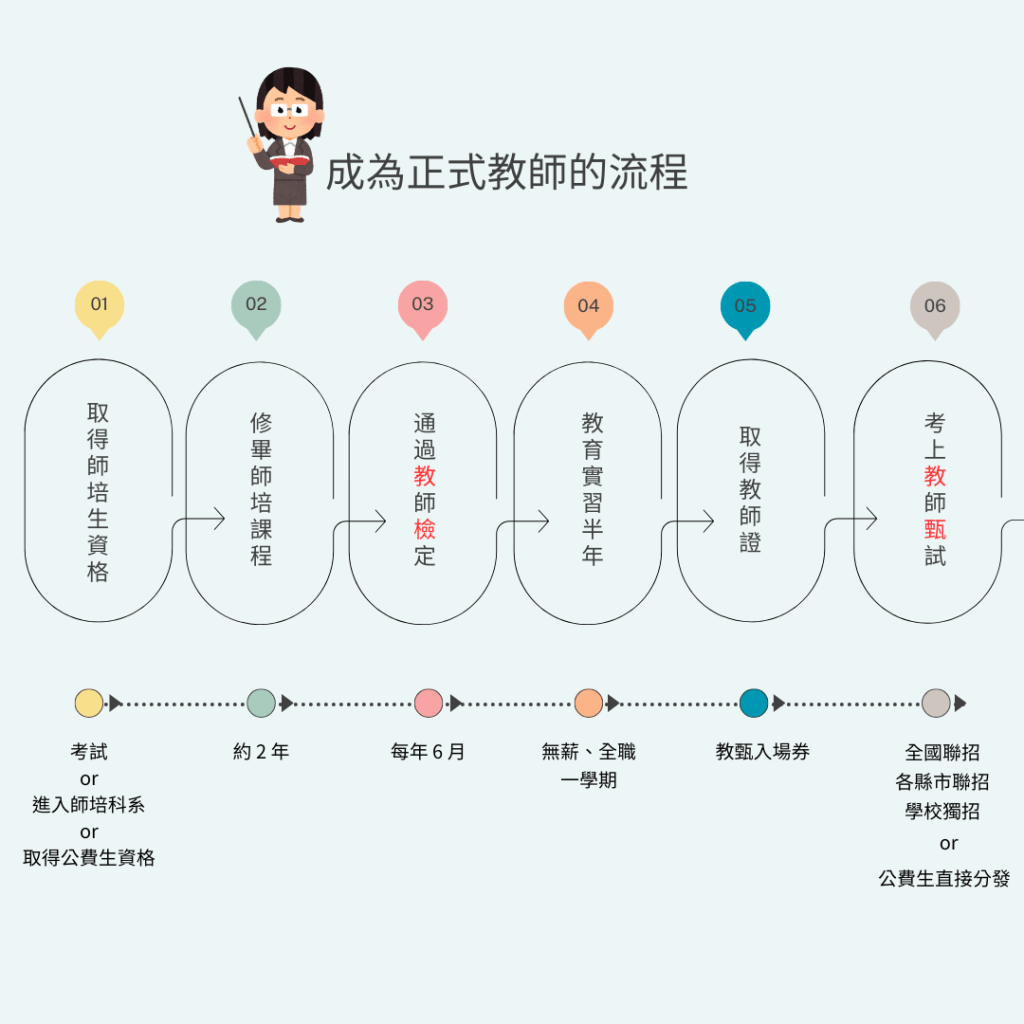 「師資培育生」(簡稱師培生或師資生)是所有老師的起點,只有具備師培生身份的在學生能修習教育學程,修畢學程後才進到教檢、實習、取得教師證等後期環節。師培生資格因系所規定而異,多數須透過考試取得,也有少數校系為入學及具備師培資格的全師培科系。而師培生資格不限大學生,通常只要有在學生身份就能報考,想成為老師,又非教育相關科系畢業者,亦可在碩士階段參加師培考試,修習教育學程。