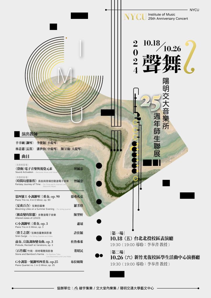 2024 年 10 月的第 4 個週六傍晚,微涼的秋風吹拂著新竹的夜空,為國立陽明交通大學(以下簡稱陽明交大)增添了些許靜謐與期待。舞台燈光逐漸亮起,樂器與電子設備整齊排開,彷彿在等待一場跨越時空的聲音對話。這場名為《聲舞》的音樂會,是陽明交大音樂所睽違五年、最盛大的師生聯展。這次演出結合經典、科技與多媒體,為觀眾帶來一場豐富的聲音饗宴,不僅是對音樂所 25 年來成果的致敬,更是對未來音樂、科技及跨域藝術的全新探索。音樂會內容涵蓋經典室內樂、沉浸式音樂科技體驗,以及多媒體影音展演,彰顯師生們的創新與情感交流。