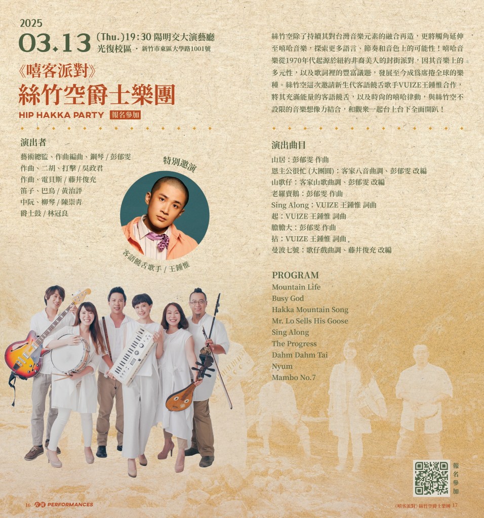 絲竹空爵士樂團帶著融合台灣本土元素的創新爵士樂,來到陽明交大獻上《嘻客派對》音樂會。這場演出令人耳目一新,以美國紐奧良的爵士樂演奏形式為基底,融入傳唱於台灣山林間的客家曲調,更邀請饒舌歌手以客語重新詮釋源自紐約街頭的嘻哈音樂。親耳聆聽過的人,無不驚嘆這場音樂碰撞的獨特魅力,這正是台灣多元文化才能孕育出的絕妙聲響。
