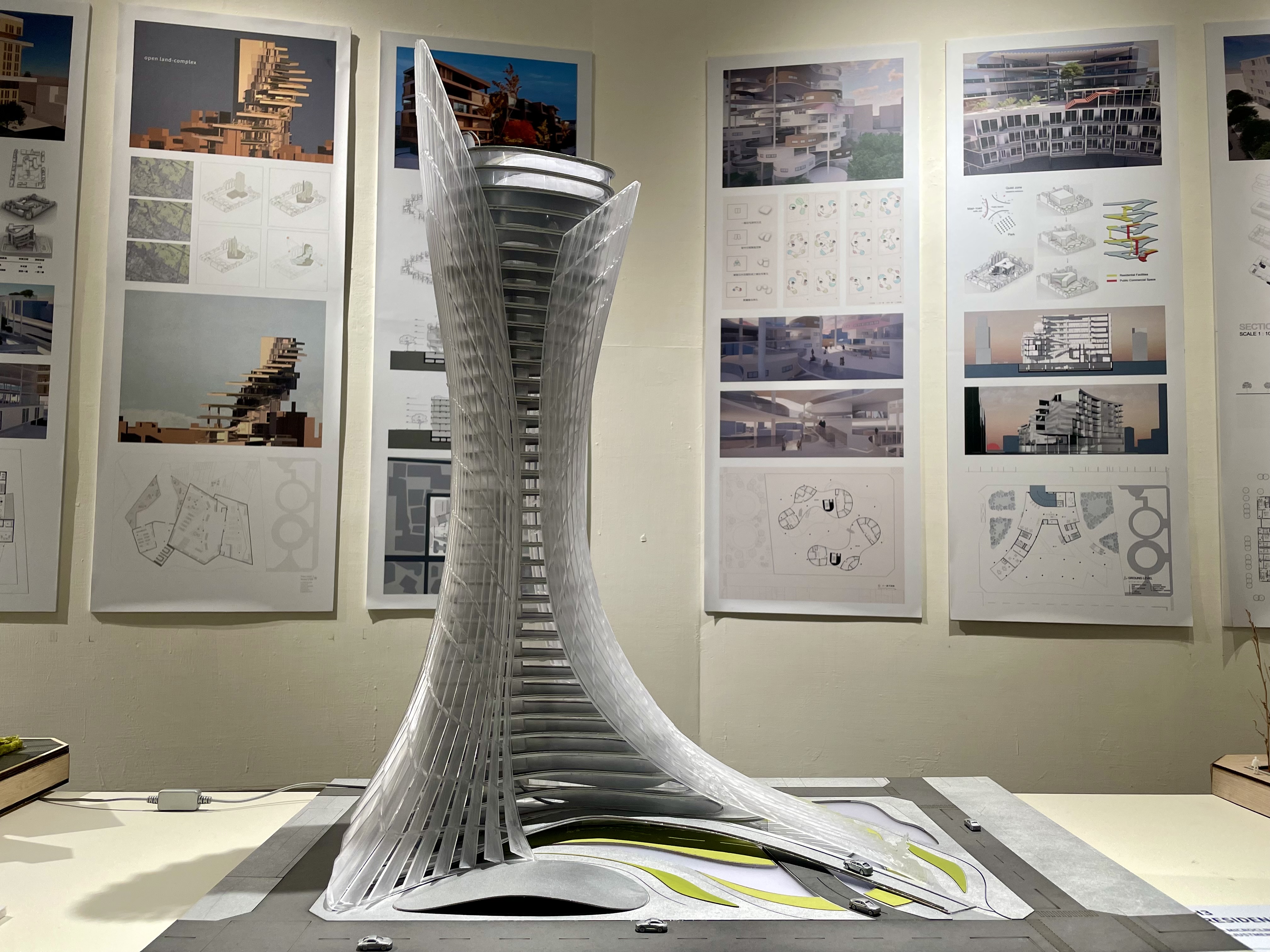 一走進「2025陽明交大建築展:『沒有想像中的遠』」的展廳,目光便會很容易的為兩側的靈動多變的建築作品所深攫。有的房屋如蜂巢狀,高低前後錯落有致,如山峰般層巒疊嶂,令人彷彿置身於扭曲的時間與空間中; 有的房屋卻高聳入雲,兼之在燈光下閃亮的銀灰色表面,令人頓生前衛的科技感,霎時分不清究竟身處現代或未來。一棟棟建築物彷彿書籍,在供人以一遮風避雨的家的同時,更記載著當地的風土民情乃至社會文化,住著住著,我們也成為了歷史的一部分。或許,建築物與我們日常生活的距離,沒有想像中的遠。