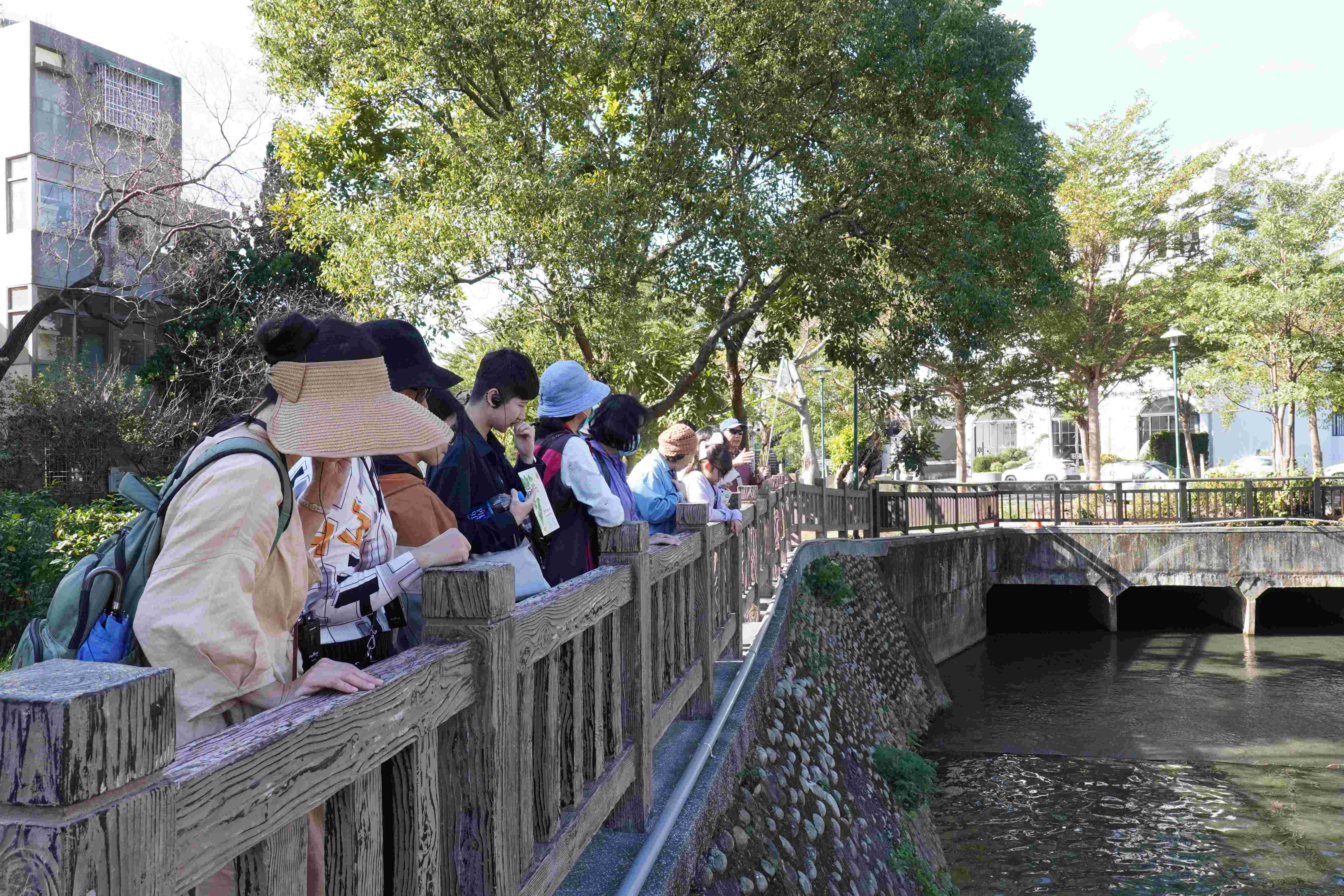 參與者手握地圖走到黎明溝畔。1970年代黎明新村四周還是農地,當時黎明溝即作為灌溉引用水。多年來幾經自辦重劃使得綠田逐漸消失,黎明溝也曾計畫要被全部填平,所幸在居民抗爭下保留了這段400公尺的黎明溝。黎明溝生態園區成立後,社區志工們自發性的捲起褲管清理黎明溪、復育原生種植栽淨化水質,使得黎明溝保留了居民童年時玩水抓魚的回憶,同時喚起居民的凝聚力。