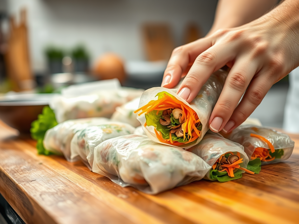母親在盤子裡鋪上一張米紙,兩面抹水,依序放入萵苣、餡料、撒上花生粉,米紙左右向中間對折,再由下往上捲起收口。沾上魚露,酸甜清爽。