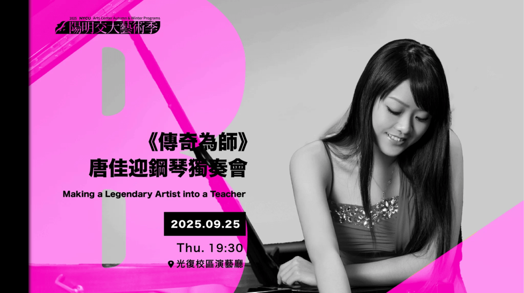 甫登場的2025陽明交大藝術季《秋冬》藝文表演,由9月25日「《傳奇為師》唐佳迎鋼琴獨奏會」揭開序幕。唐佳迎自幼熱愛音樂,十四歲遠赴英國深造,屢獲獎項,並活躍於歐洲與亞洲舞台。其論文《傳奇為師》更獲學界肯定,展現學術與藝術並進的才華。
